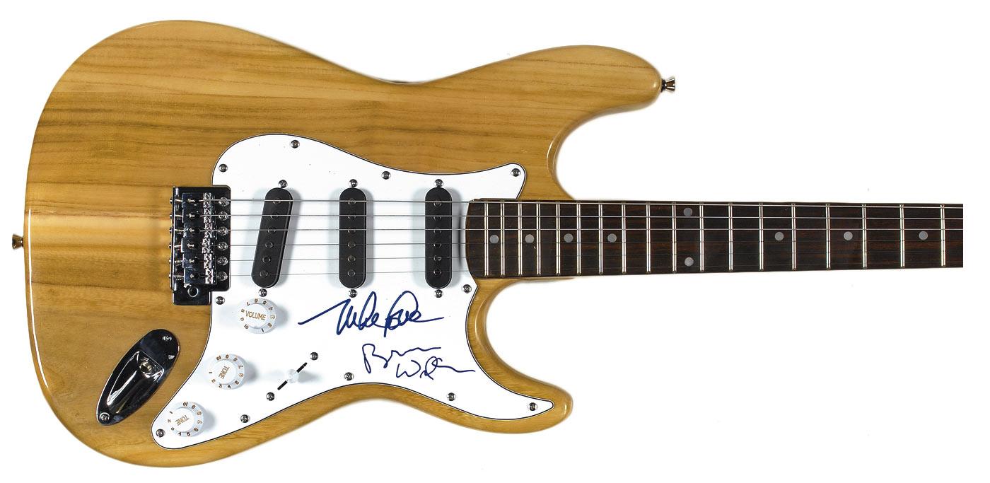 Natural wood-finish Stedman Pro ‘stratocaster-style’ electric guitar, signed on the white pickguard in blue felt tip by Brian Wilson and Mike Love. In fine condition. Accompanied by a photo taken at time of signing. Oversized. Pre-certified Roger Epperson/REAL and RRAuction COA.
