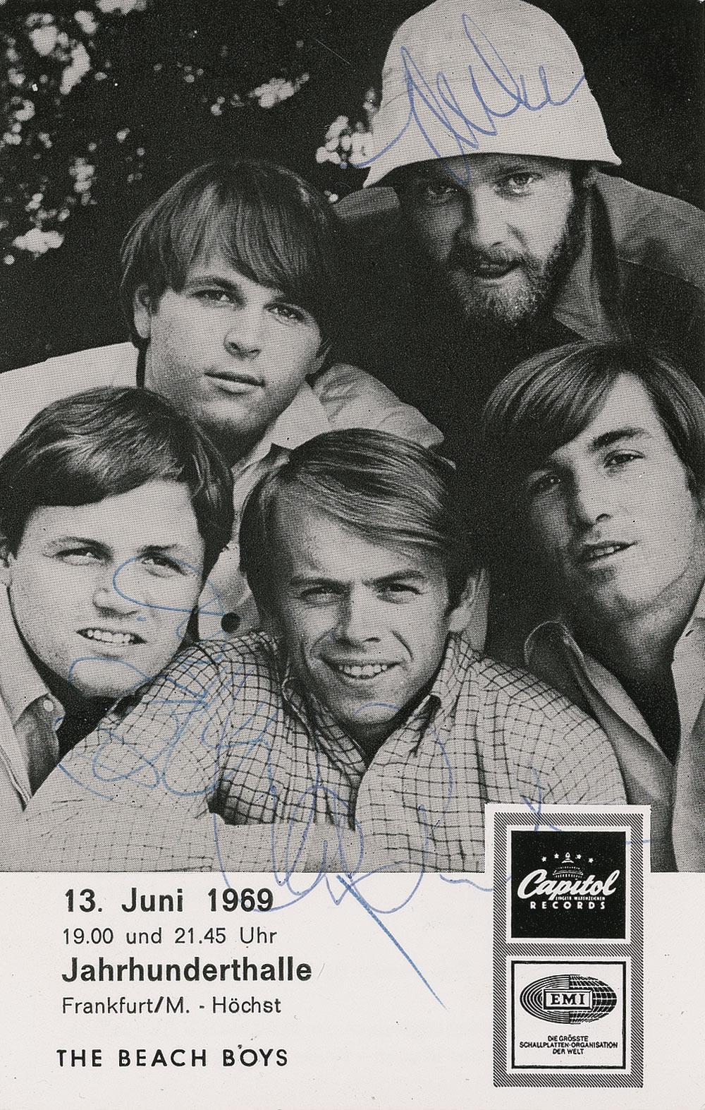 Vintage 3.5 x 5.75 Capitol records cardstock promotional photo for a Beach Boys appearance in Frankfurt on June 13, 1969, signed in blue ballpoint by Dennis Wilson, Carl Wilson, and Mike [Love]. In fine condition, with light overall contrast to both Wilson’s signatures.