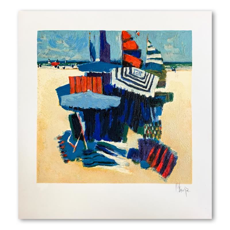 "Beach Hideout" is a limited edition serigraph on paper by Claude Fauchere. It is numbered and hand signed and includes a letter of authenticity. Measures approximately 11.5" x 11.5" (image).