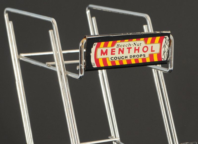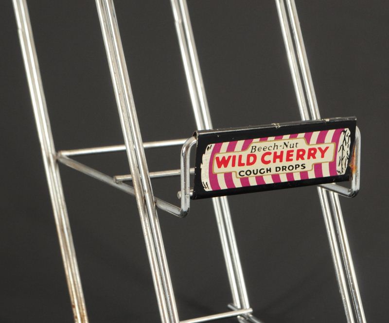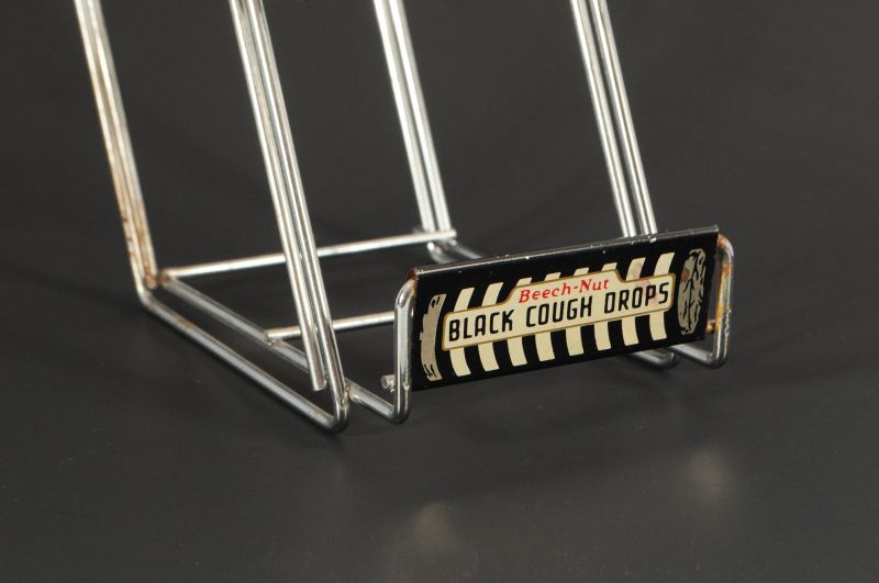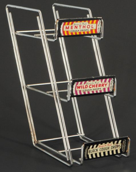 Beach-Nut Cough Drops Wire Countertop Rack. Measures 3 1/2" wide x 8 1/2" deep x 8 1/2" tall.