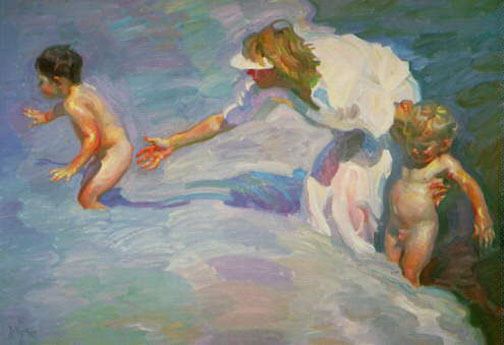 Professor John Asaro has been celebrated by critics and collectors alike for decades. This beautifully colored image of a Mother and her children at the beach in Coronado, Californias captures with great sensitivity the emotions of each of its subjects as they test their strengths against the elements of sun, sand, and crashing surf . Serigraph on Paper 24x34" #34/195