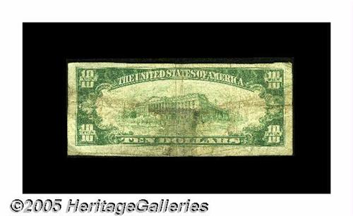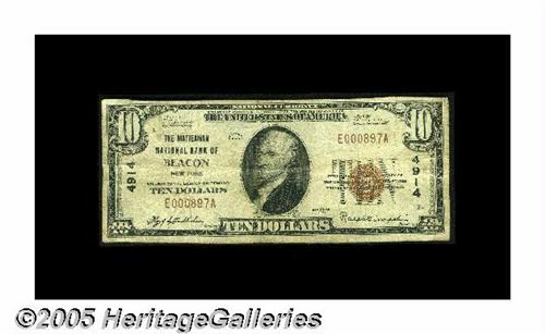<B>Beacon, NY</B></I> - $10 1929 Ty. 1 <B>The Matteawan NB</B></I> Ch. # 4914<BR>A <B>Fine</B></I> note from a Dutchess County institution which printed all its small notes under this, its second issuing title. The census from here stands at only seven pieces in the 1929 series. Our 2004 FUN auction included a $20 Type 2 from here which sold for $1,380 in F-VF. While this example is unlikely to surpass that result, its overall scarcity in small may push it surprisingly high.