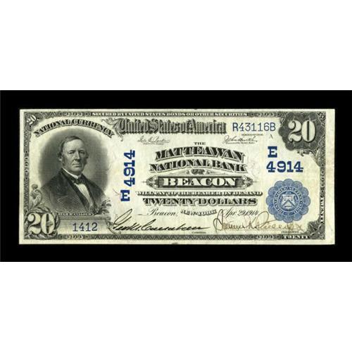 <B>Beacon, NY</B></I> - $20 1902 Plain Back Fr. 657 <B>The Matteawan NB</B></I> Ch. # (E)4914<BR> A pretty $20 example with great pen signatures and the look of an even higher grade note. Sharp <B>Very Fine+,</B></I> one of the nicest large notes we've had to offer from this mid-Hudson Valley locale. <BR><BR><b>Shipping:</b> Coins & Currency (<a target="_blank" href="http://www.heritageauctions.com/common/shipping.php">view shipping information</a>)