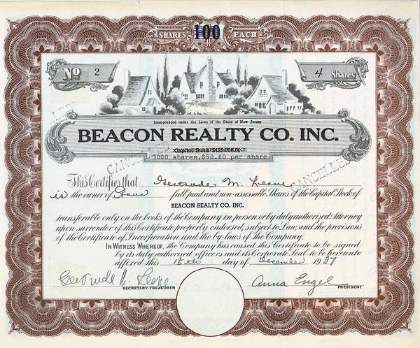 1937, New Jersey. Stock certificate for 4 shares. Brown/Black/White. Vignette of three homes at top center. Two tape strips approx. 1" in size stuck to top left and bottom left of document. Assignment certificate attached. Stamp cancelled.