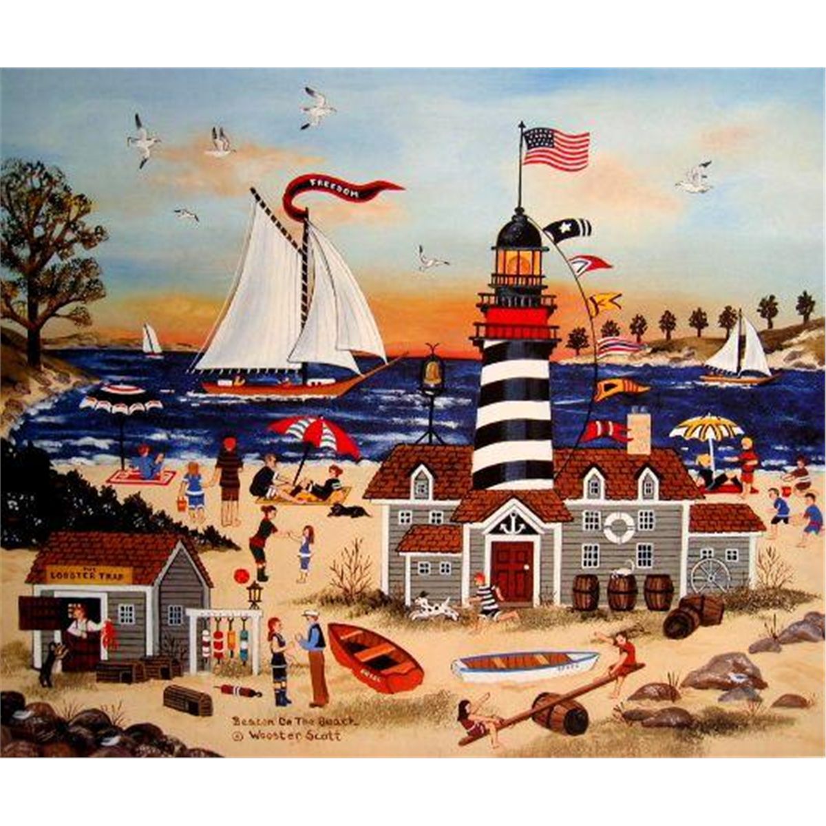 Offset Lithograph, 11" by 13" Paper: Lustro 100% Archival Edition Size: 495 Artist's Proofs: 95 Hand Signed Description Jane Wooster Scott Biography Jane Wooster Scott entered the millennium prepared to establish new records. She concluded the last millennium named by the Guinness Book of Records as the most reproduced artist in America , beating out runner-up Pablo Picasso for that distinction. TIME magazine was quick to report the surprising news, pleasing her countless collectors and admirers. Today this versatile and productive artist stands alone as the finest painter of Americana on the planet. Her works hang in museums, in public buildings and private homes in Europe , Asia and South America as well as in the United States . She has become legendary for her exceptional scenes of America 's celebrations and holidays, providing a trove of visual lore unlike any other. A dazzling coffee-table book of Scott's astonishing canvases continues to be a bestseller. Her paintings trace the cavalcade of the American experience. From her studio in Sun Valley , Idaho , Scott continues to discover new venues, celebrated traditions and everyday pleasures and beauty in this land of boundless joys and effervescent cultural diversity. In the years ahead, this dedicated artist will scour the country's nooks and crannies finding unusual, colorful panoramas of life, some typical, others rare and some so commonplace they go unnoticed by the casual observer. Wooster Scott has an unfailing eye for the charm and magnificence of her native land and paints it in her own breathtaking style for the ages. Youthful and energetic, and possessed with an aura of glamour, the personable Wooster Scott is as much at home among celebrities as she is with the ordinary folk who populate her paintings. Indeed, she has become a celebrity herself. She mingles comfortably with scores of stars, political lights and sports figures at her shows. She is in demand socially wherever she finds herself. Her collectors include Elizabeth Taylor, Paul Newman, Arnold Schwarzenegger, Marlon Brando, Charles Bronson, Steve Wynn, Merv Griffin and many, many other prominent art-lovers. Her enormously successful shows have been hosted by Sylvester Stallone, Dyan Cannon, Kirk Douglas, Carol Burnett and the late actors Henry Fonda and Gene Kelly. Wooster Scott has embarked on a series of campus paintings, which include University of Pennsylvania and the University of Southern California . Several others are in the planning stages. Scott is all for progress but laments the toll it takes on the landscapes she paints so poignantly. "It gets increasingly difficult to find the United States as I imagine it was a century ago-the barns, stables, cottages and town halls. Water pumps and windmills, covered bridges and one-room school houses are disappearing. But I intend to continue to seek out the remaining treasures of our heritage and paint them for my own joy and for people who share my love of country."