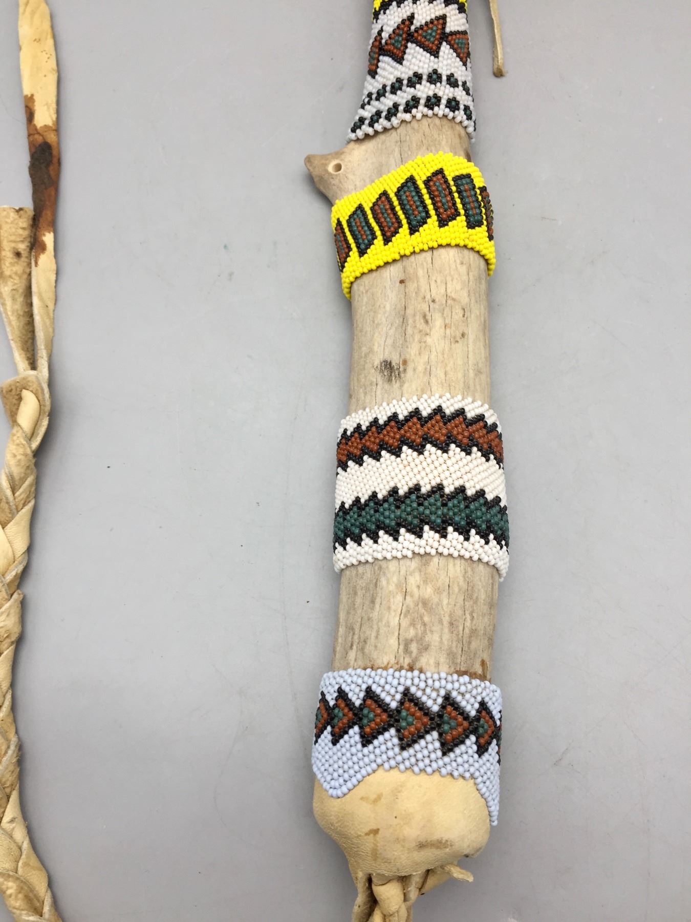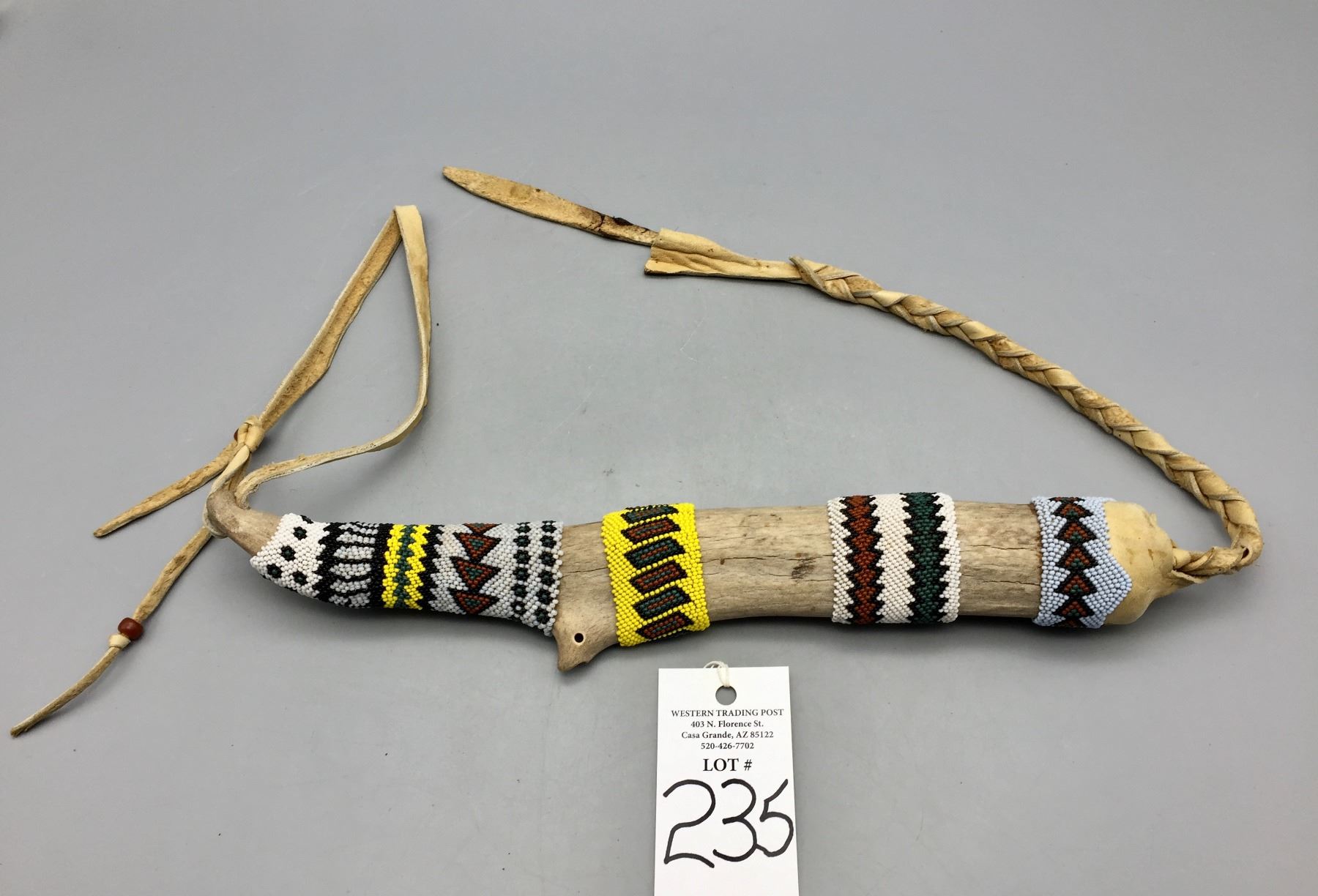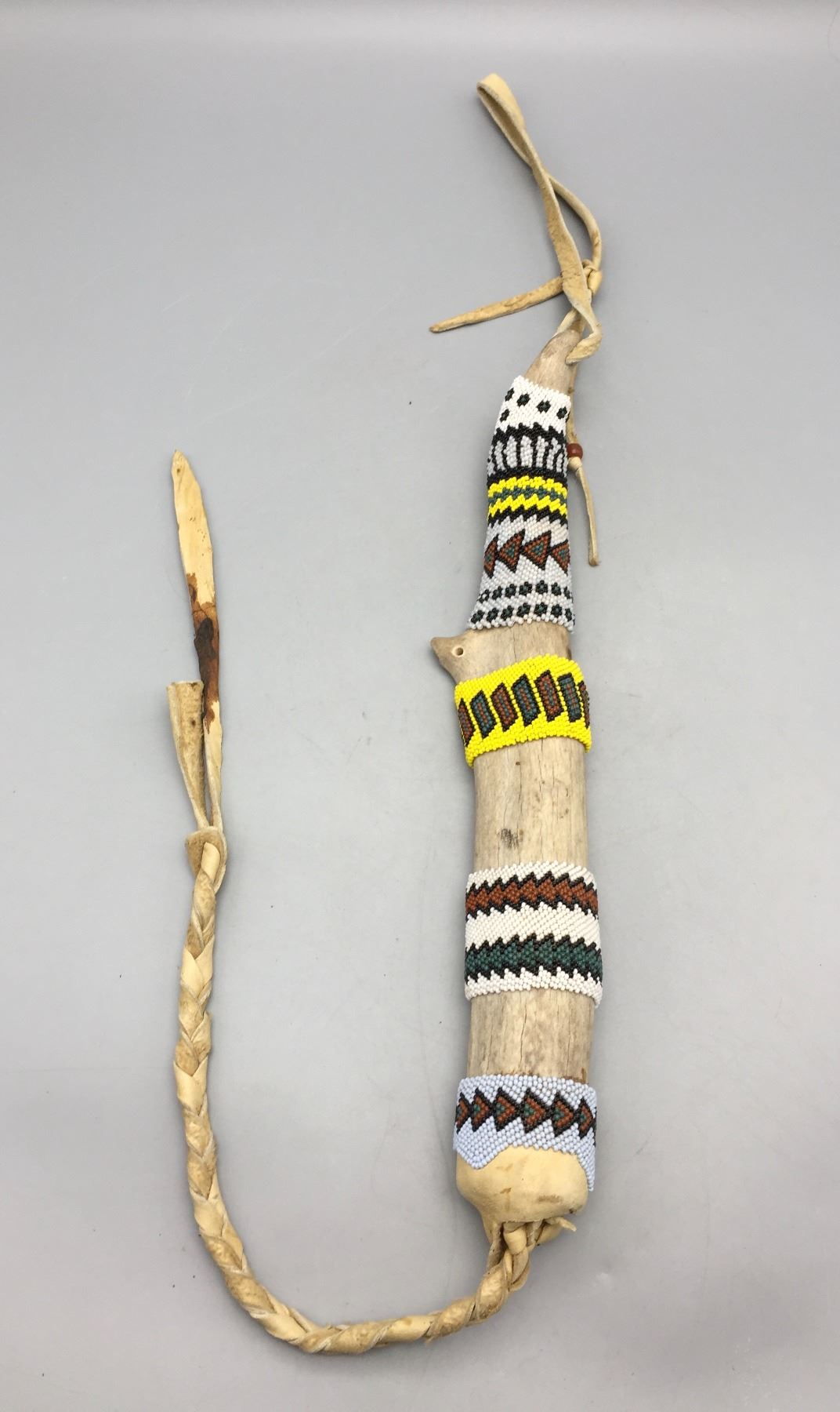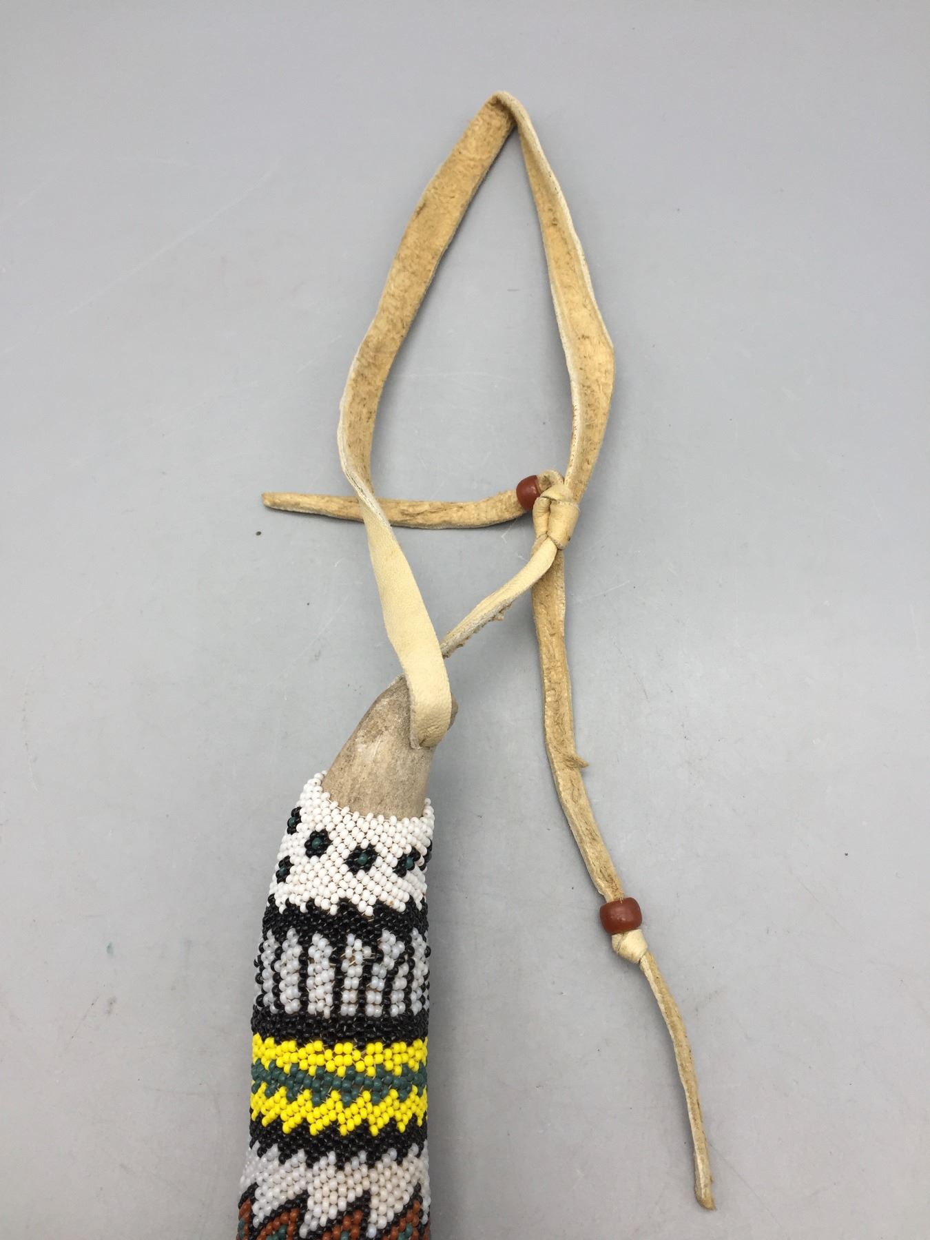 Description: Offered for sale in this lot is an intricately beaded antler quirt with leather accents. Maker: Unknown. Approx. Age: Vintage. Size: 14†long. Condition: Good for its age, normal wear expected. Please look closely at the pictures - they are an important part of our description. Shipping: There will be a $8 handling / packaging fee for shipping this lot. The actual cost of postage will be added on top of that.