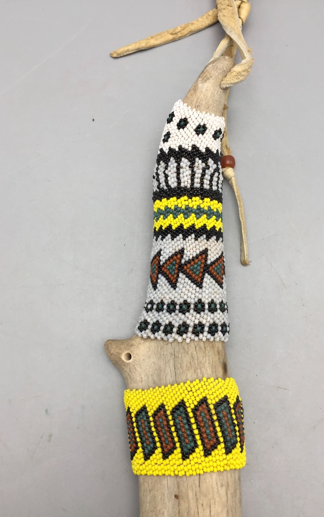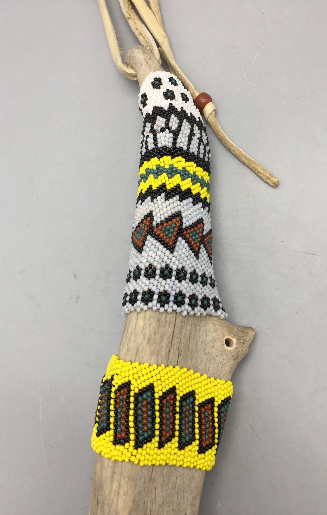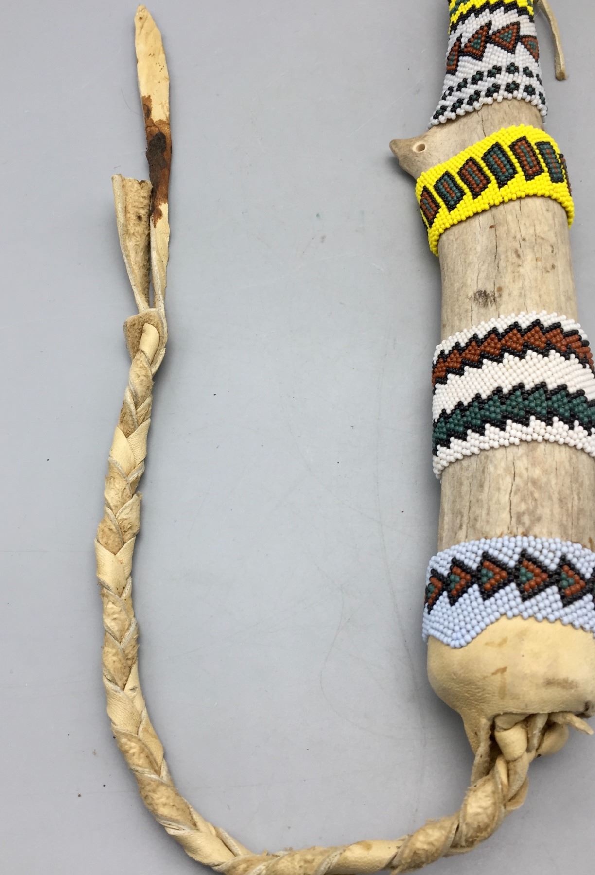 Description: Offered for sale in this lot is an intricately beaded antler quirt with leather accents. Maker: Unknown. Approx. Age: Vintage. Size: 14†long. Condition: Good for its age, normal wear expected. Please look closely at the pictures - they are an important part of our description. Shipping: There will be a $8 handling / packaging fee for shipping this lot. The actual cost of postage will be added on top of that.