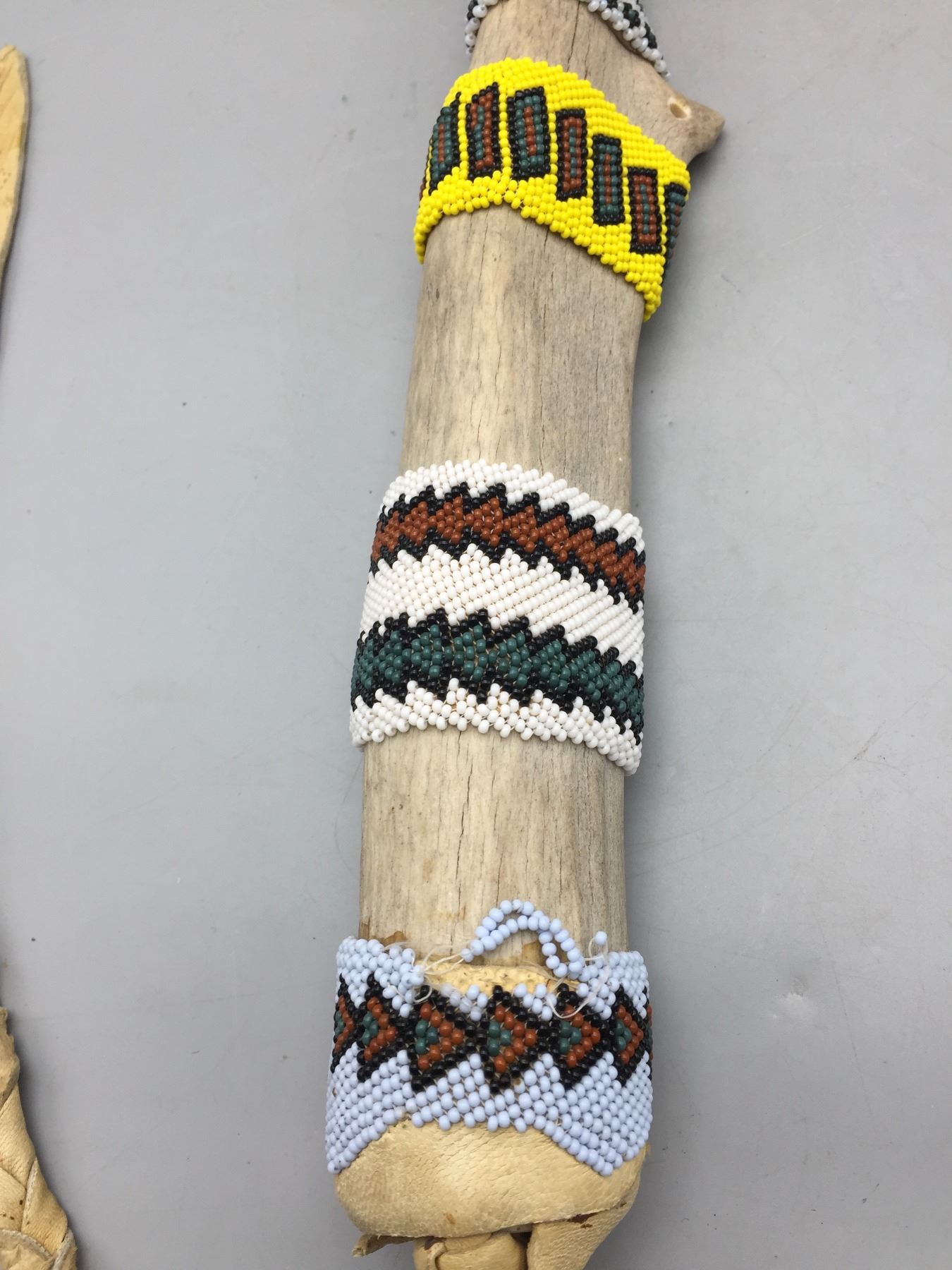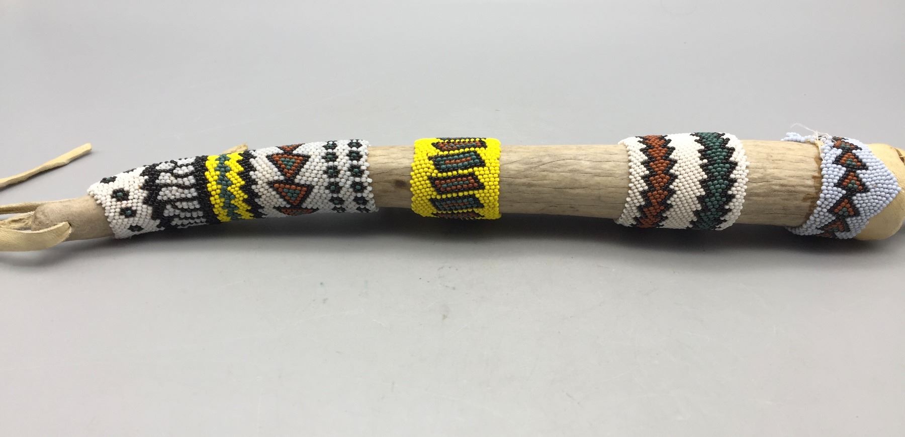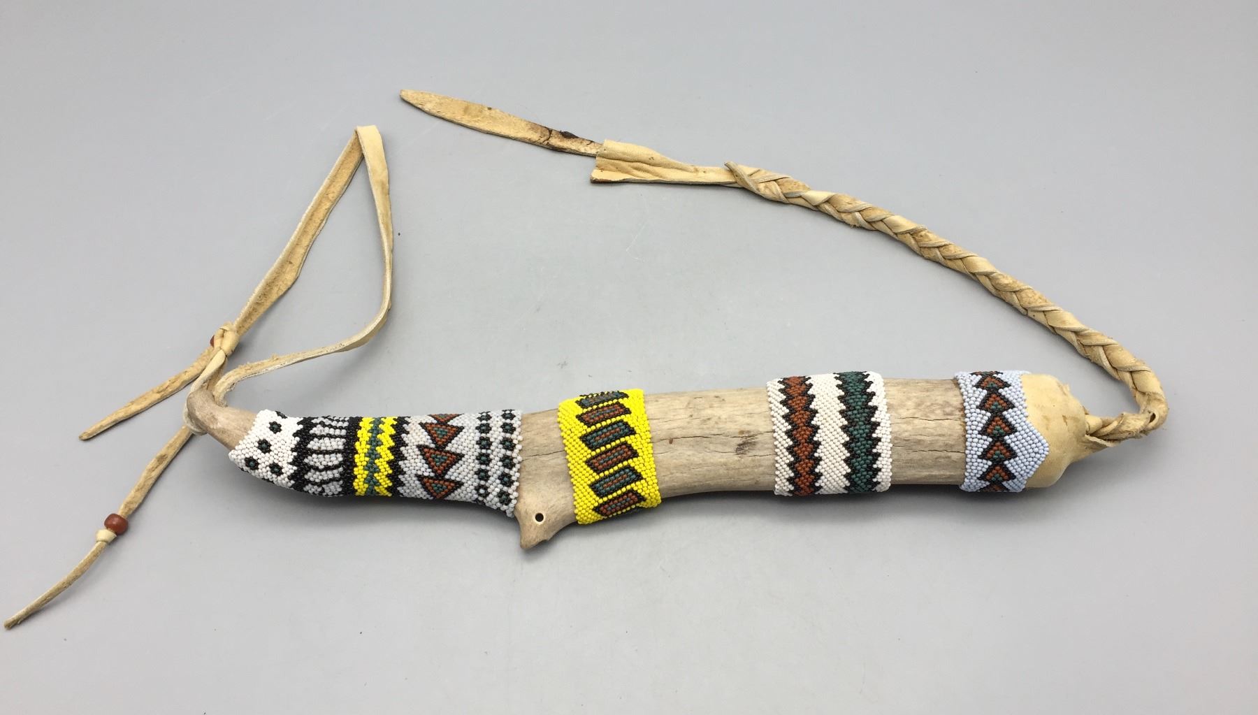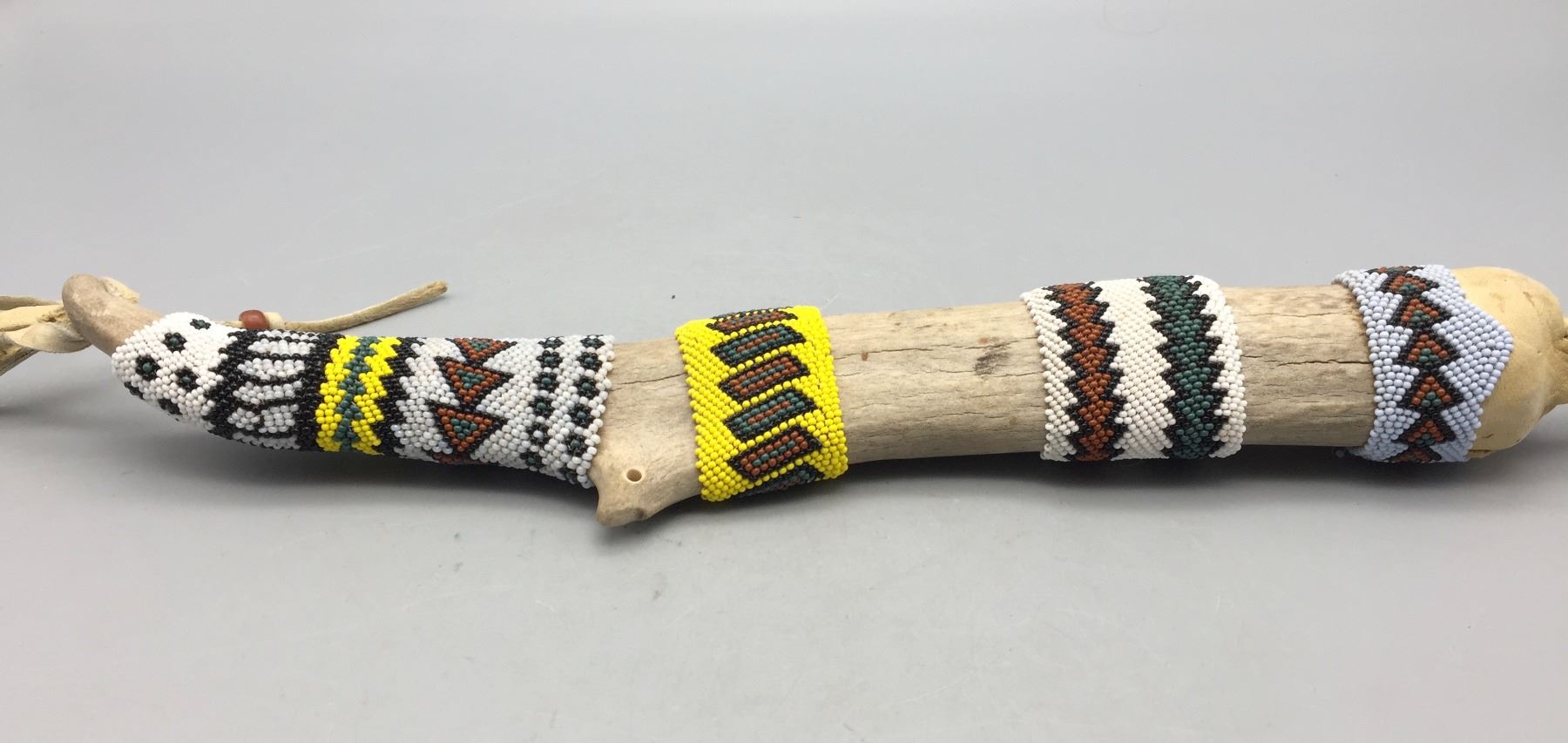 Description: Offered for sale in this lot is an intricately beaded antler quirt with leather accents. Maker: Unknown. Approx. Age: Vintage. Size: 14†long. Condition: Good for its age, normal wear expected. Please look closely at the pictures - they are an important part of our description. Shipping: There will be a $8 handling / packaging fee for shipping this lot. The actual cost of postage will be added on top of that.