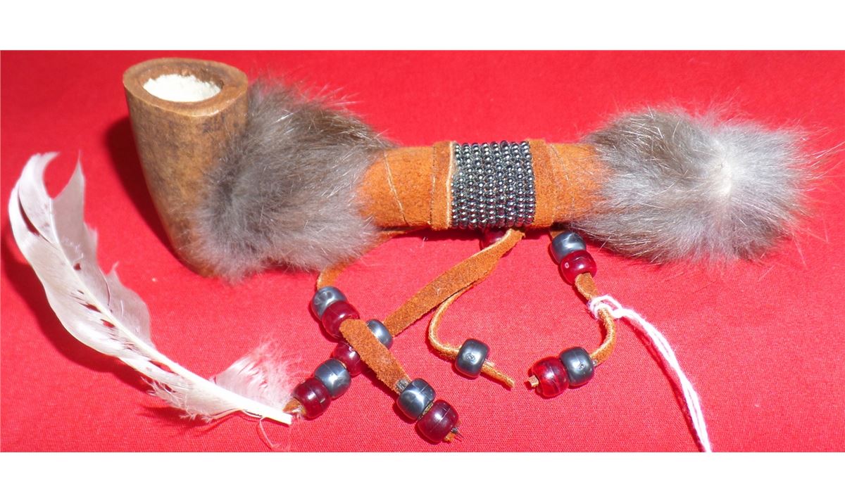 1960's Beaded Antler Smoking Pipe measuring 6"x2". This item is made from fur, antler, glass and leather beads. It is believed to be Cherokee. Condition: Nice unsmoked condition. Shipping: 15.00