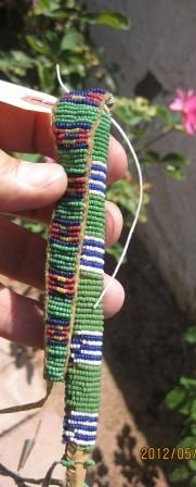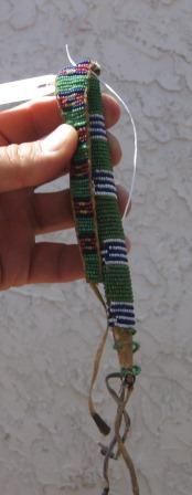 Beaded Rawhide Awl case, Northern Plains has tin lonls, Circa 1890 Probably Apache measures 6 x 1 inch, Shipping 12.50; Fair some bead loss