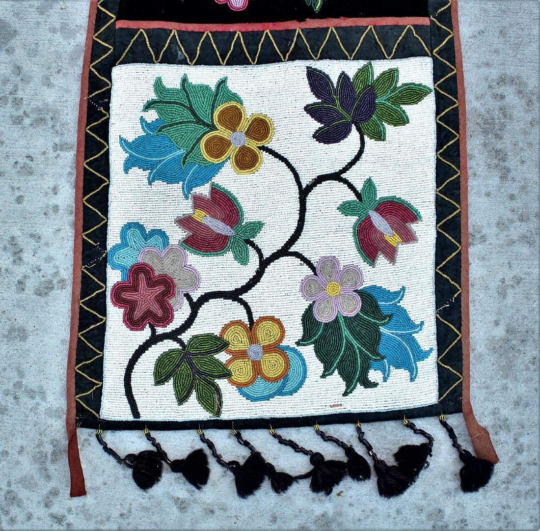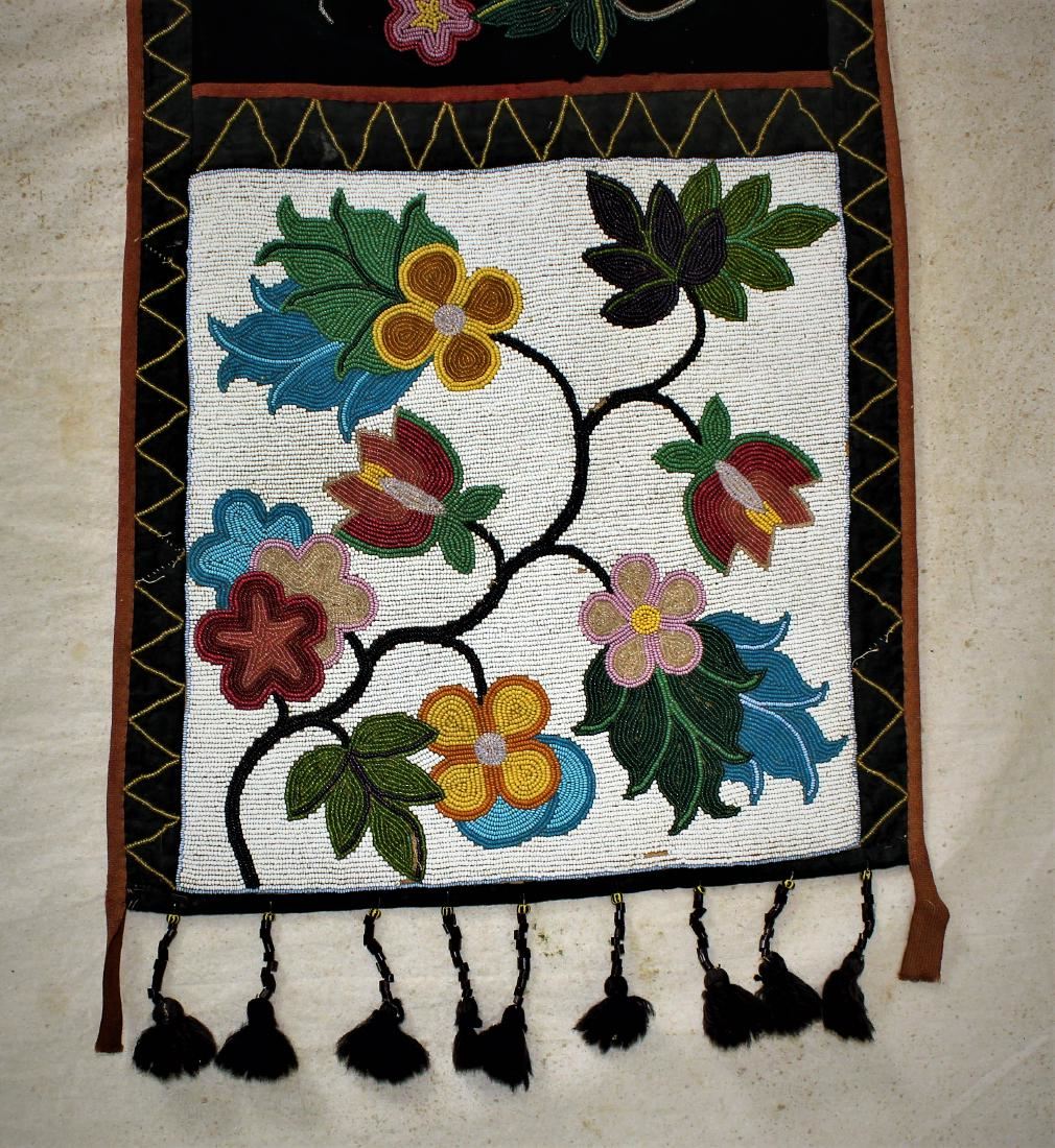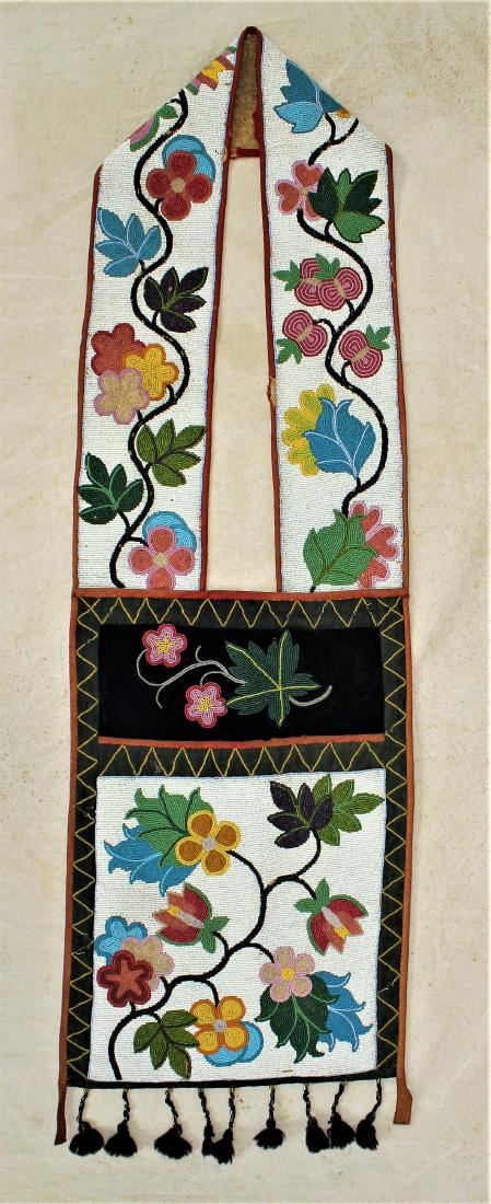 Ojibewe bag, of the second half of the 19th Century. A slender bag with beaded centerpeice, scrolling vines and floral design, that include ornate beading with wool and velvet materials. Measuring 13 1/2"x 39".