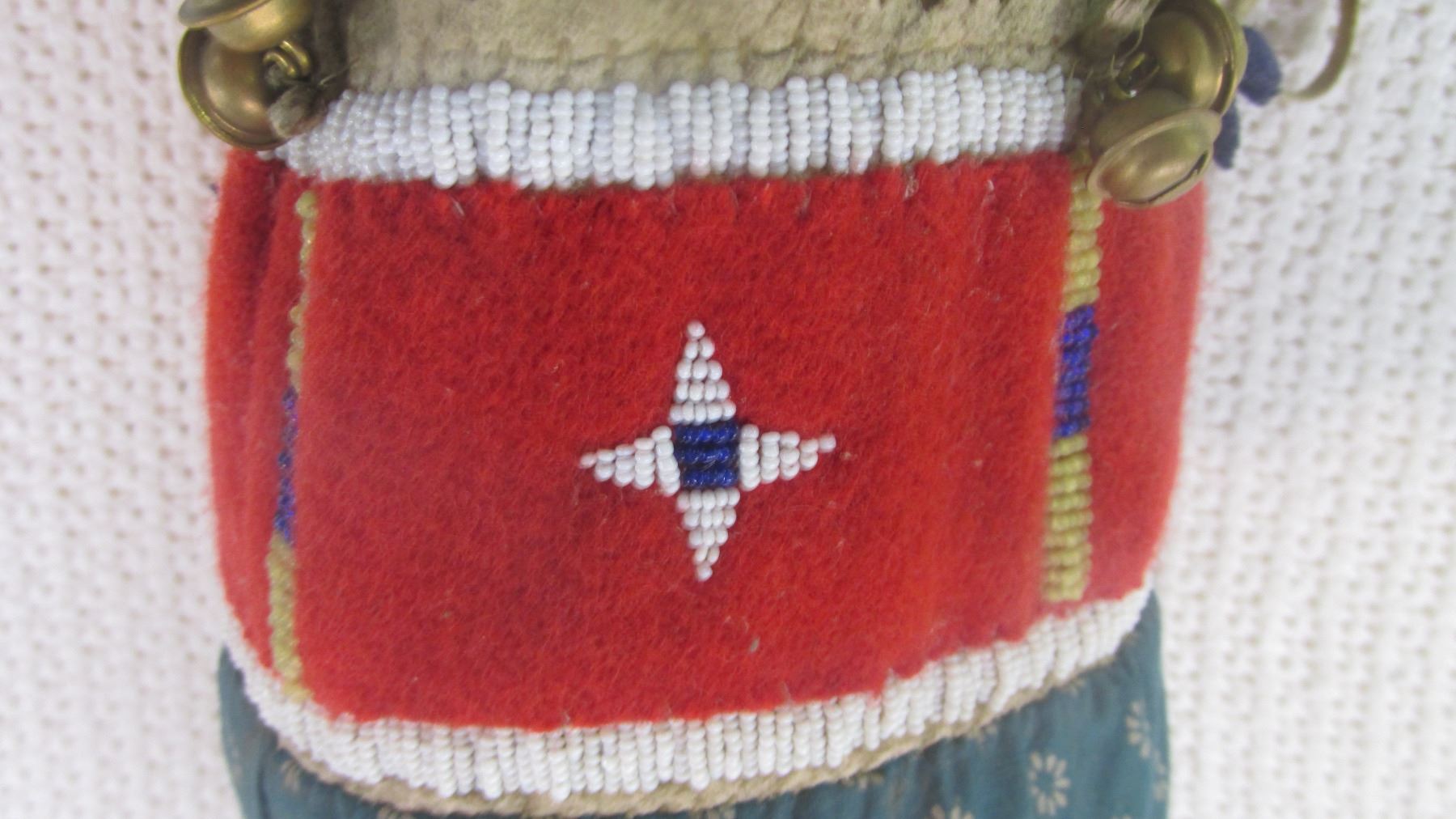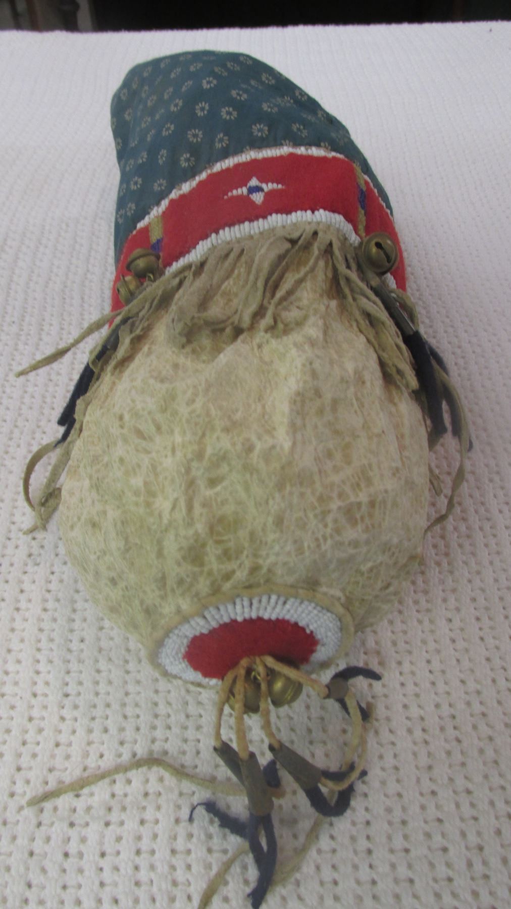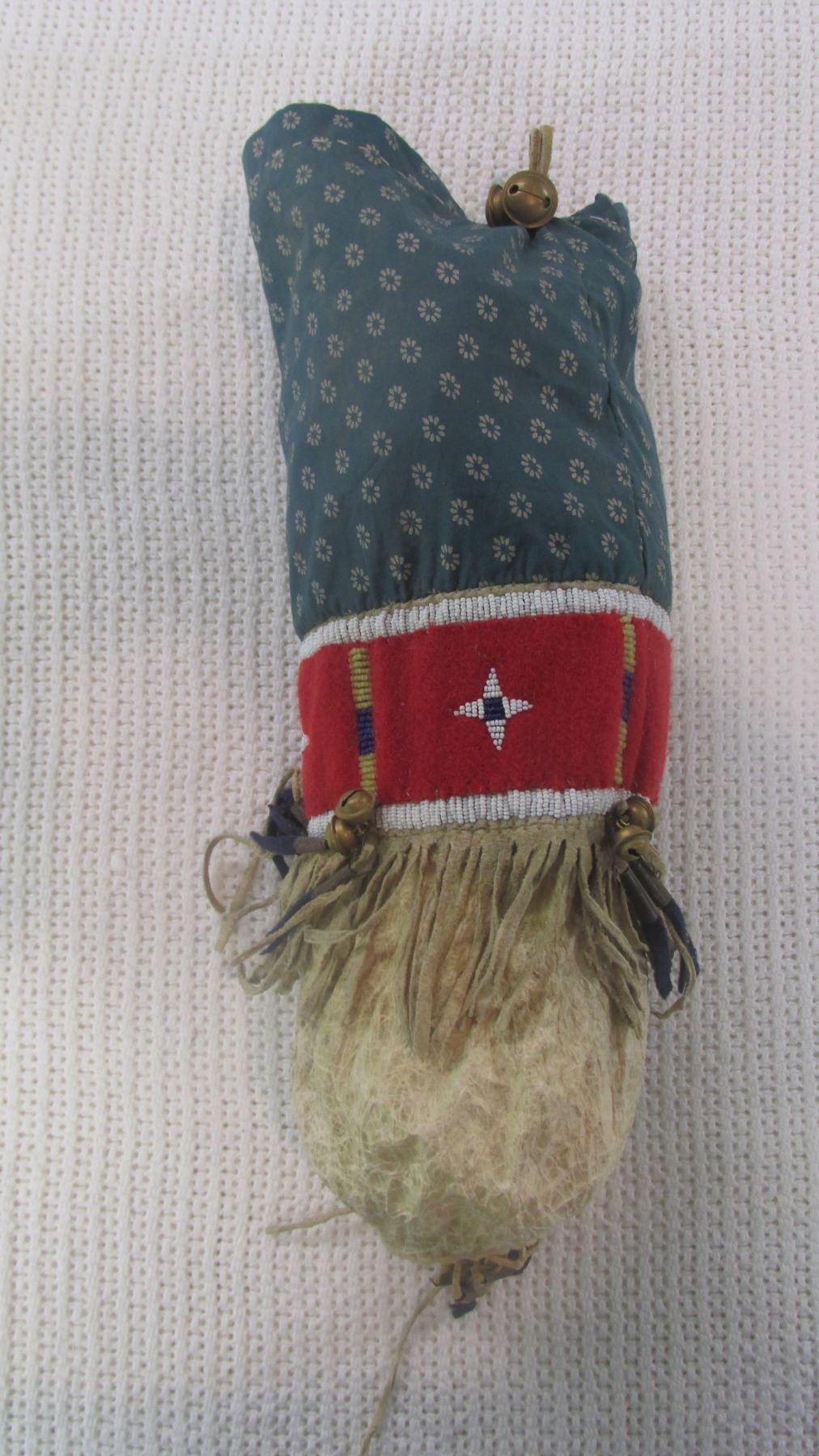 Beaded bladder bag. Beaded on red wool cloth with calico top and real bladder at bottom. Fringe and tin cones. 14" long.