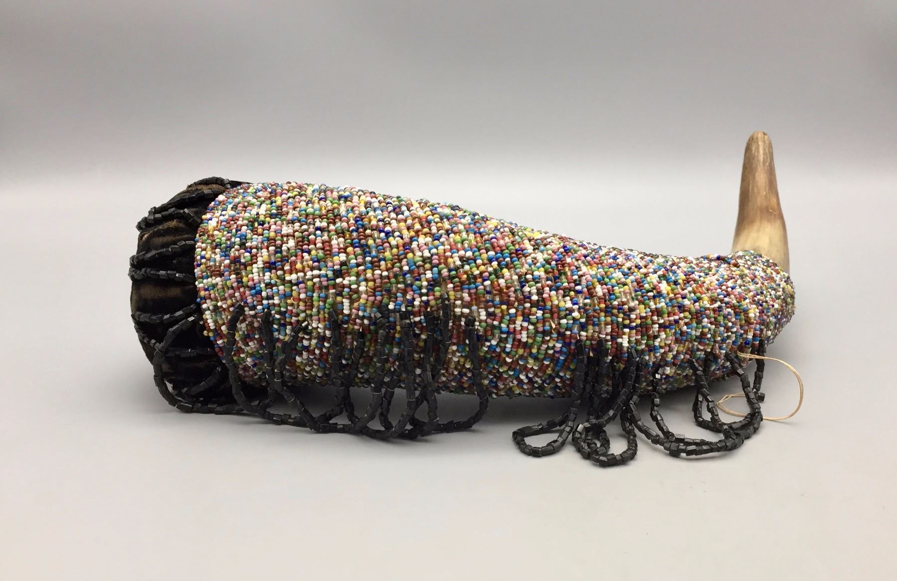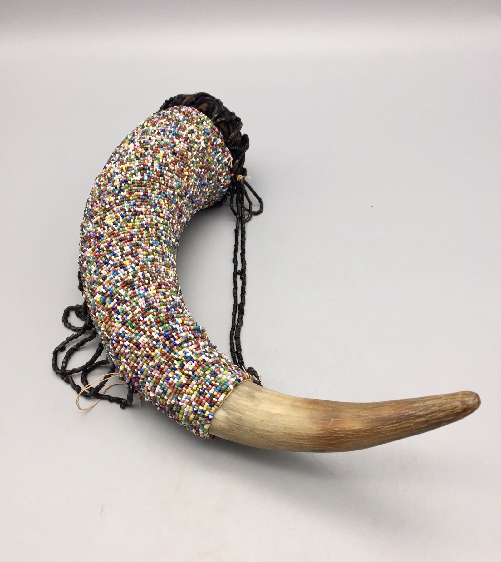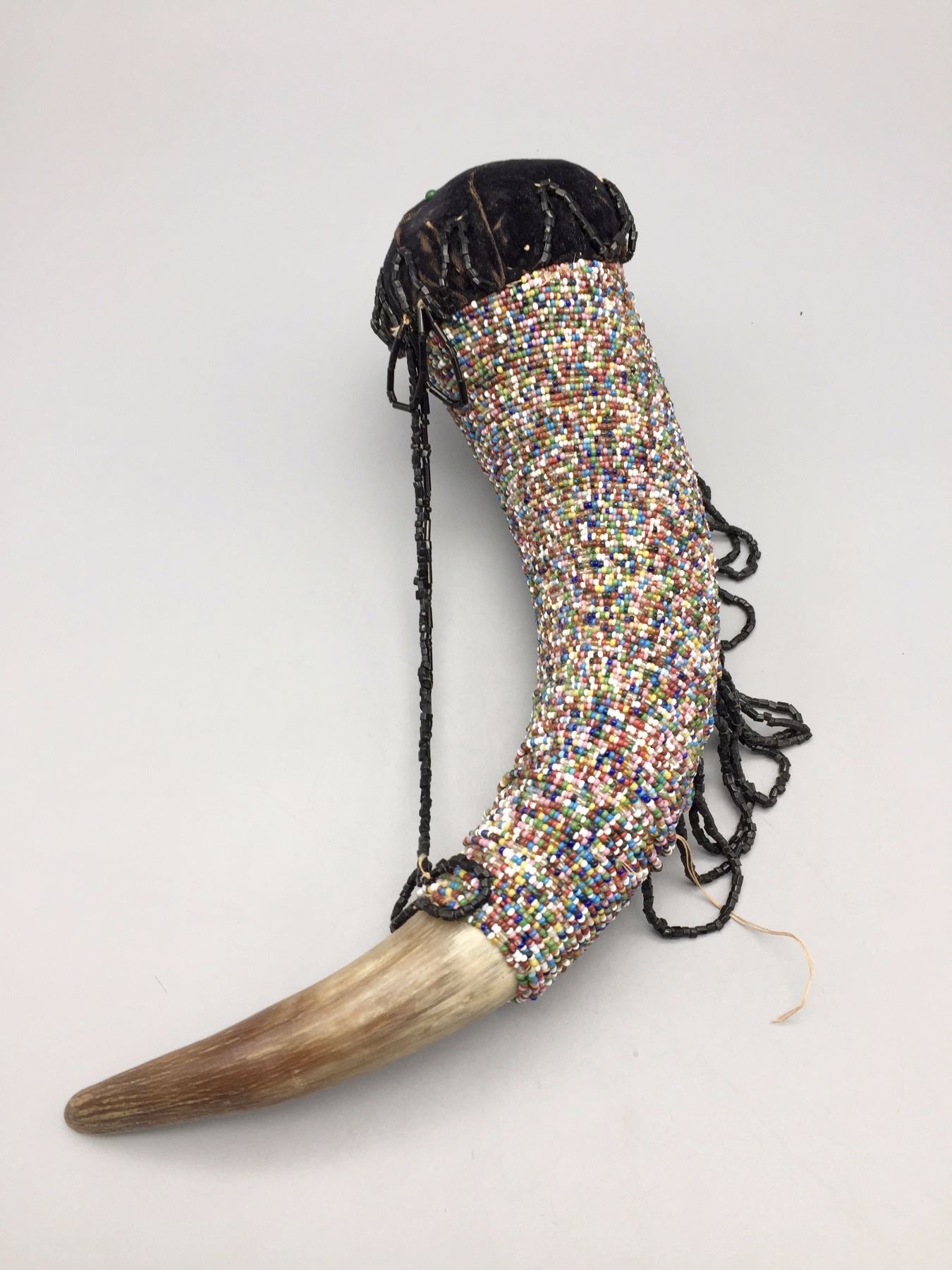 Description: Unique beaded horn pin cushion. Maker: Unknown. Approx. Age: Circa early to mid 1900s. Size: Approx. 12” l x 3 3/8” w. Condition: Pretty good for its age, normal wear expected. Please look closely at the pictures - they are an important part of our description. Shipping: There will be a $5 handling / packaging fee for shipping this lot. The actual cost of postage will be added on top of that.