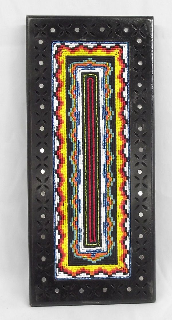 Beaded Carved Wood Footed Platter - Kills Thunder. Arizona artist Kills Thunder worked her magic on this handsome carved wood platter. She beads vibrant designs on anything and turns them into wonderful decor. This platter is solid wood and measures 21.75''L x 10''W x 1.5''H.