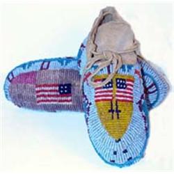 Beaded Ceremonial Moccasins with American flag design. Not old but fabulous work. 6" long. Estimate $500-$600.