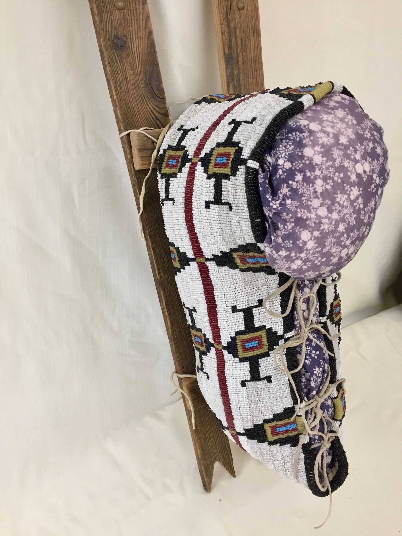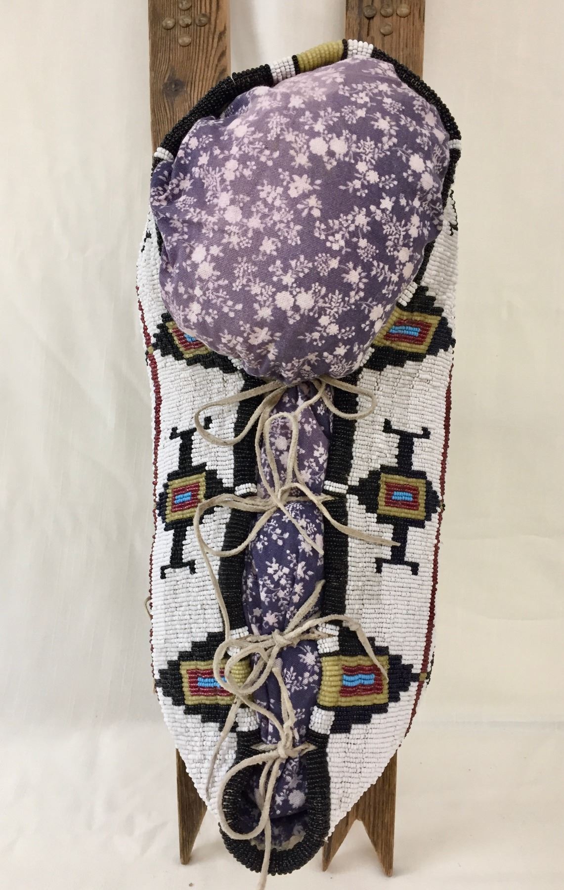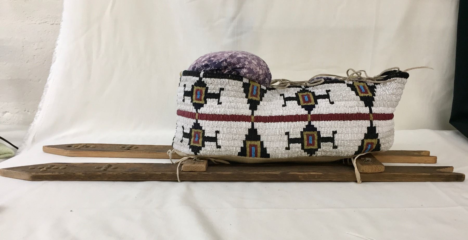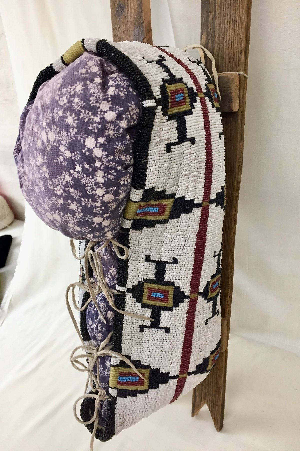 Description: Offered for sale in this lot is a beaded cradle, featuring intricate bead work and leather ties set on a decorated wood frame.