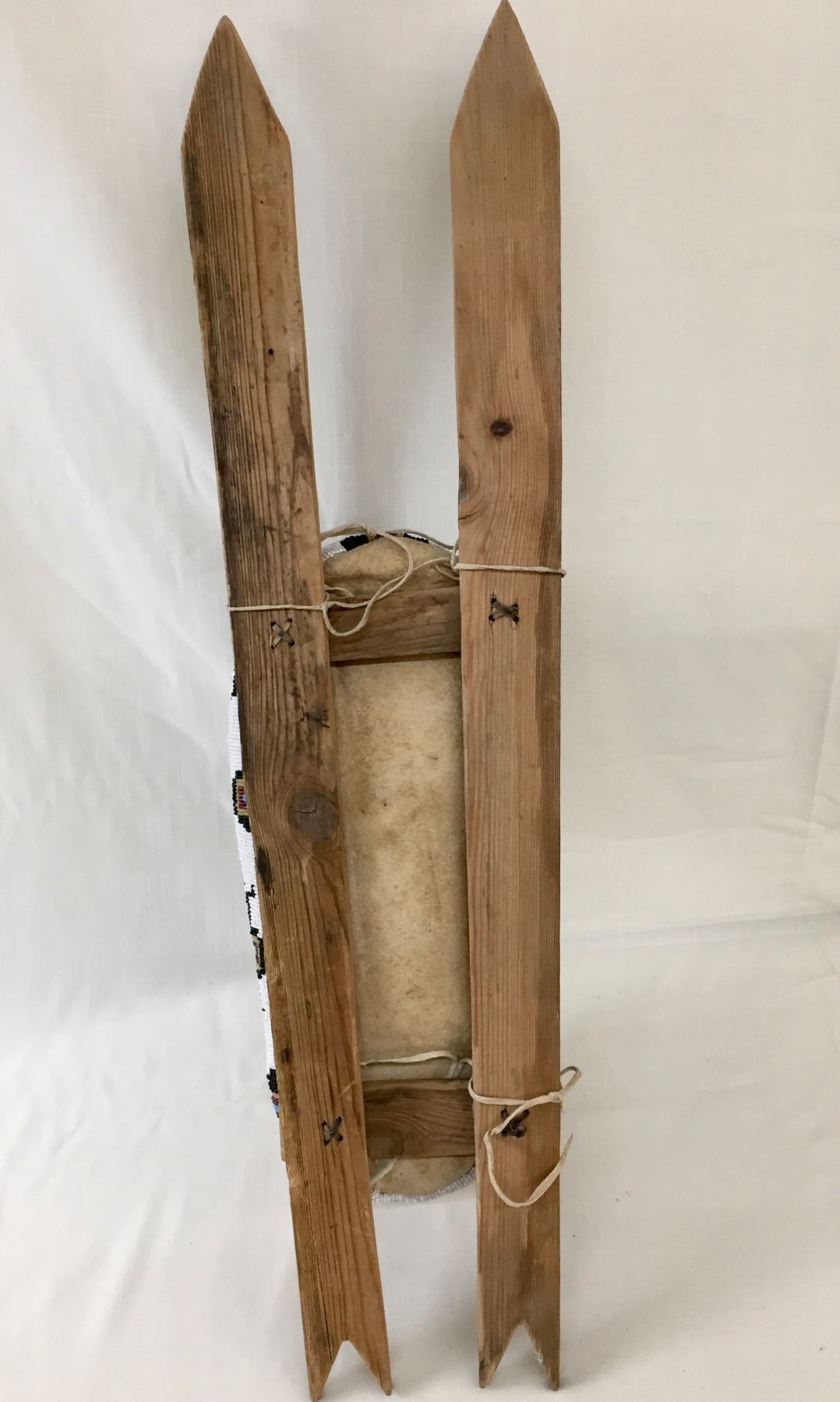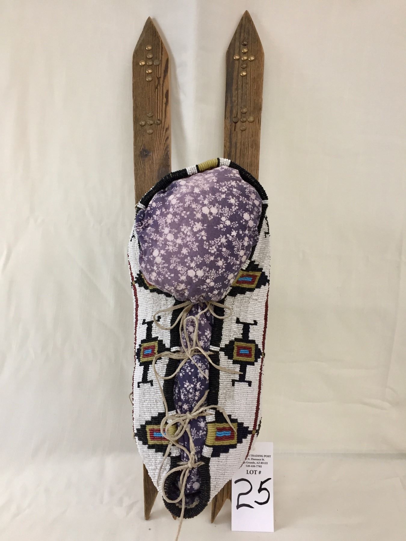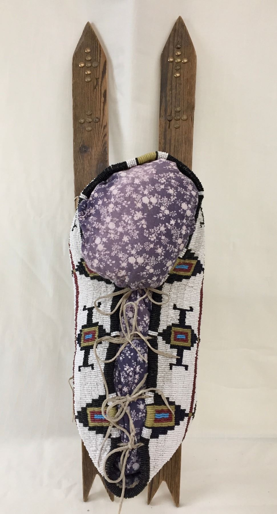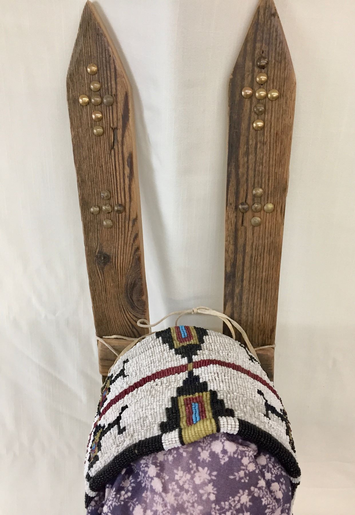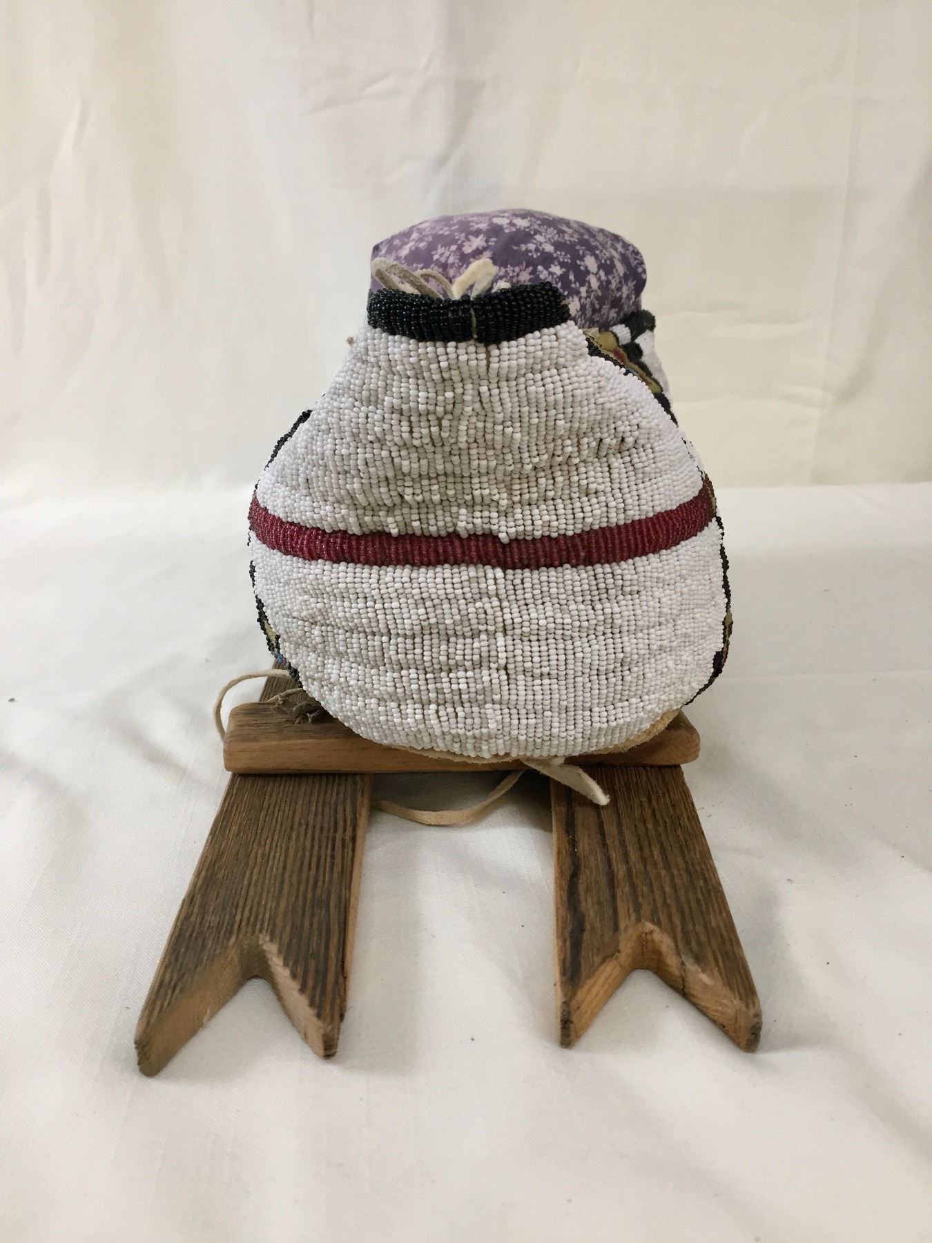 Description: Offered for sale in this lot is a beaded cradle, featuring intricate bead work and leather ties set on a decorated wood frame.