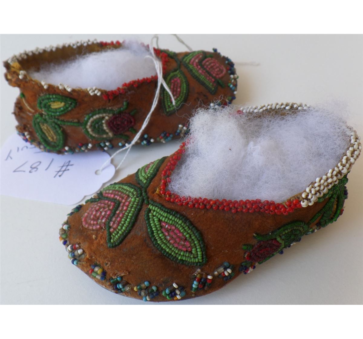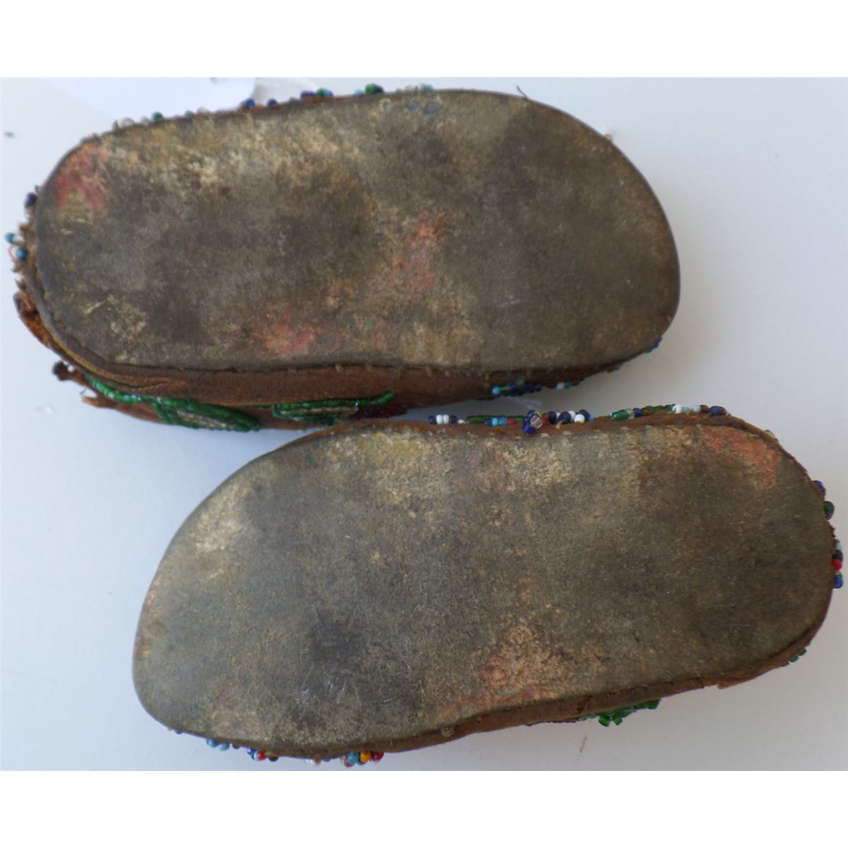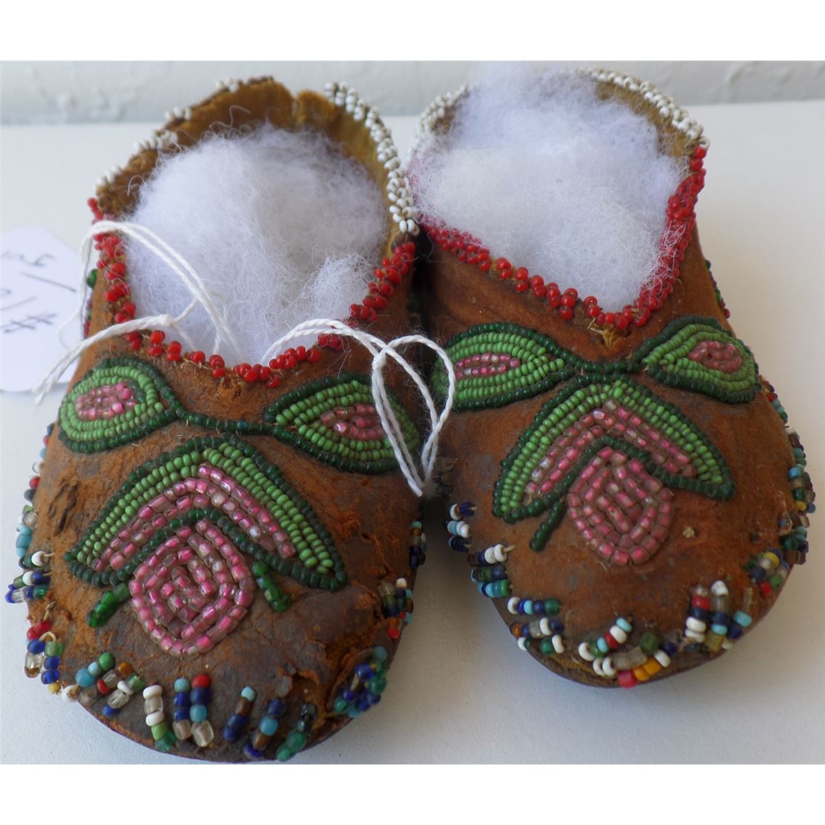 Beautiful beaded child's moccasins from the 1890's made from deer hide and glass beads. The moccasins have slight bead loss and scrapes. They are believed to be from Wisconsin, USA and measure 2 1/2 x 5 inches. Shipping $14.50