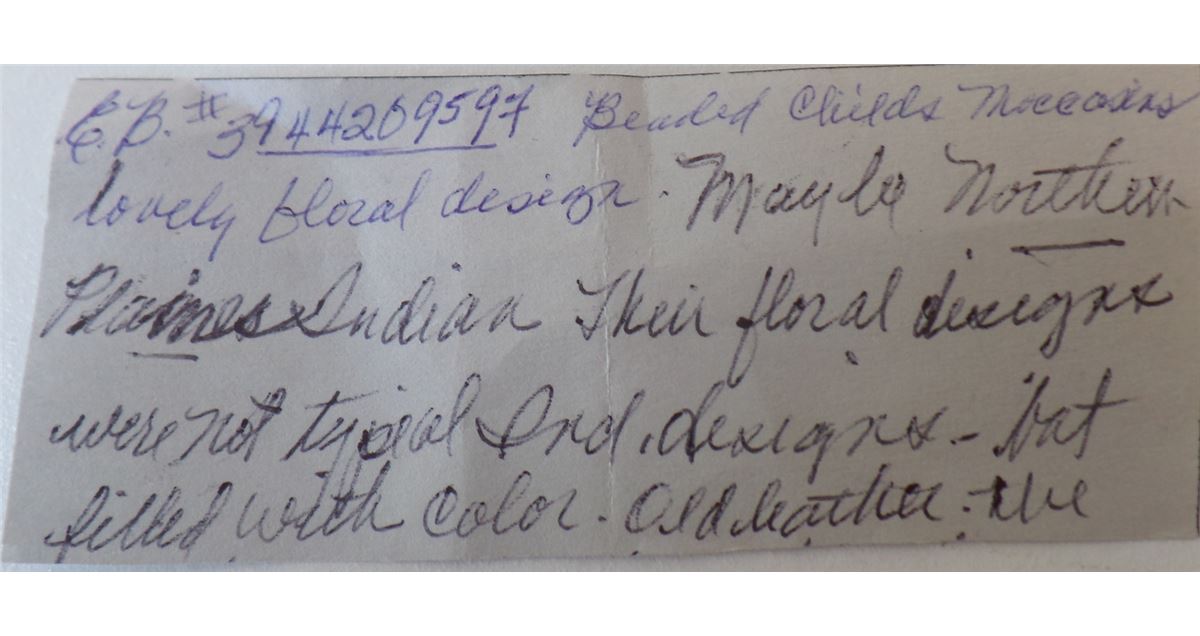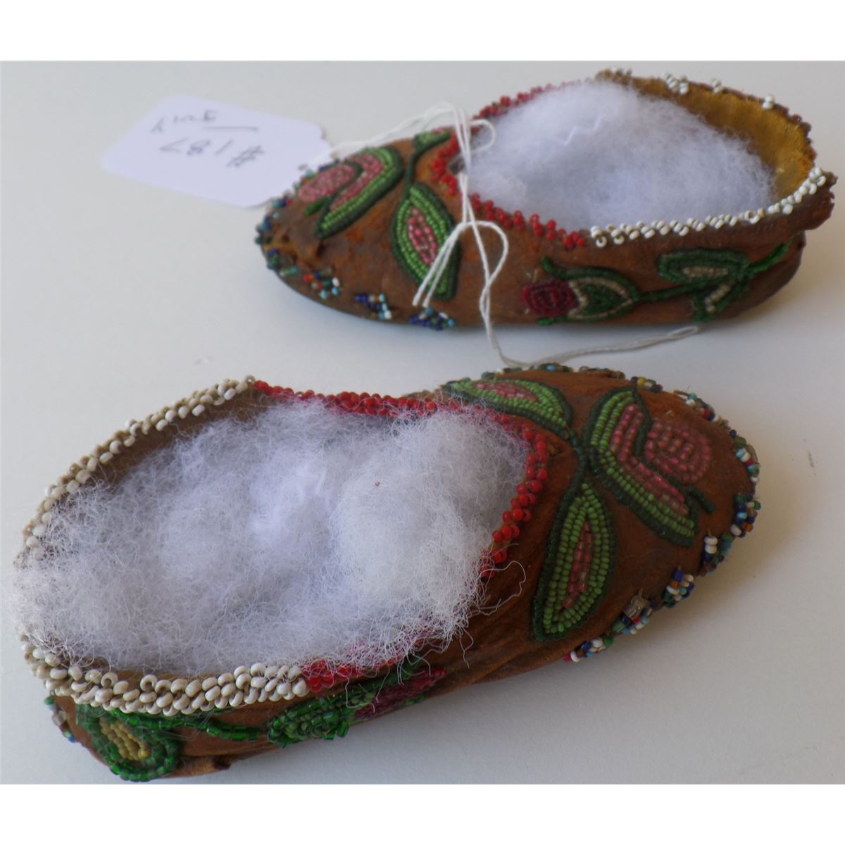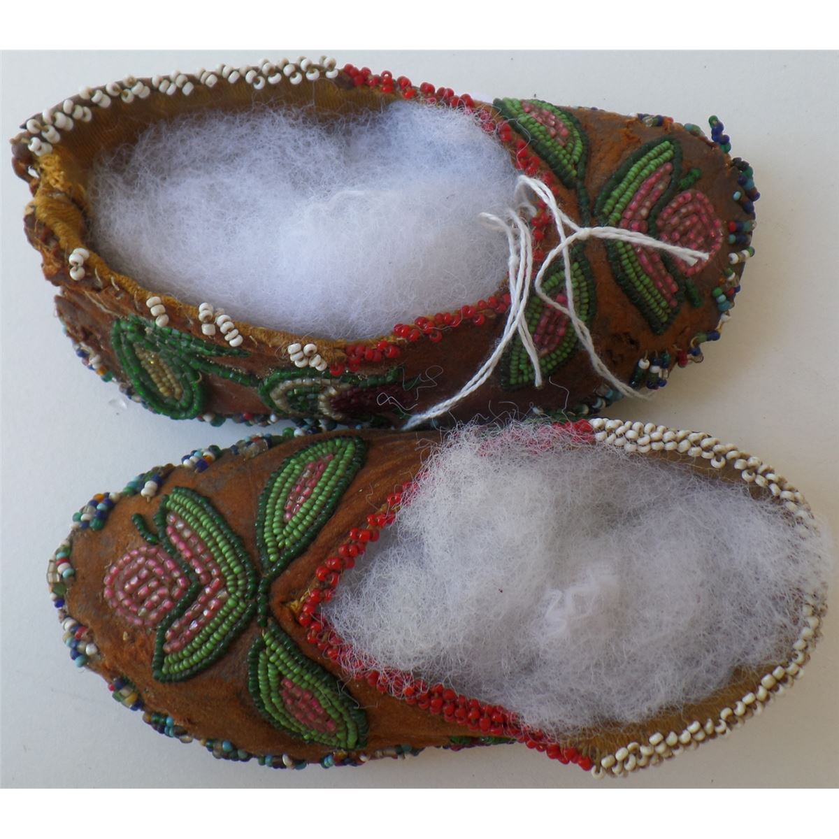 Beautiful beaded child's moccasins from the 1890's made from deer hide and glass beads. The moccasins have slight bead loss and scrapes. They are believed to be from Wisconsin, USA and measure 2 1/2 x 5 inches. Shipping $14.50