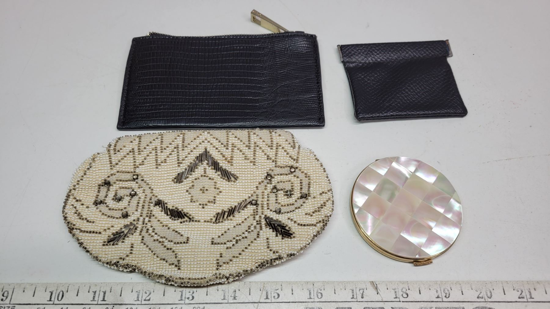 Beaded Clutch, Leather Wallets and Vintage Compact - mirror broken