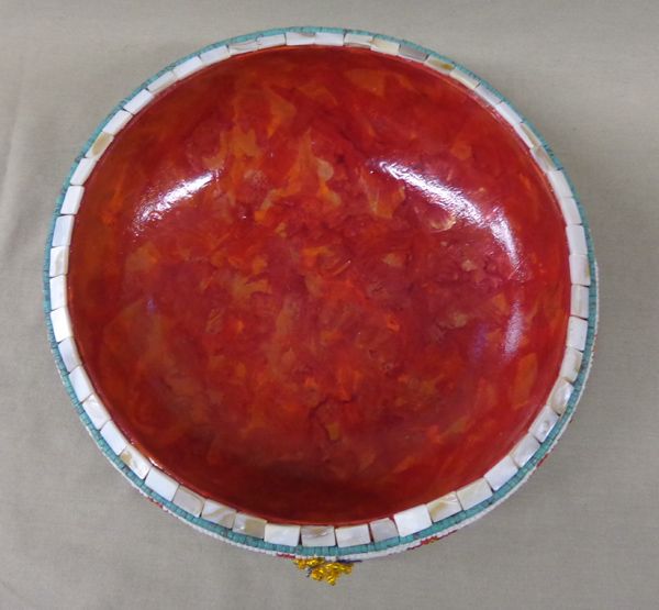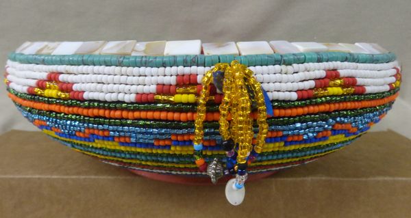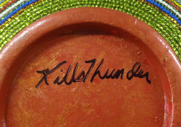 Beaded Console Bowl by Kills Thunder. Measures 9.5'' opening x 11''D x 3''H, Beautiful craftsmanhip from this noted artist. The bowl is wood and she's colorfully painted the interior. The beadwork speaks for itself, colorful with typical Native American designs.