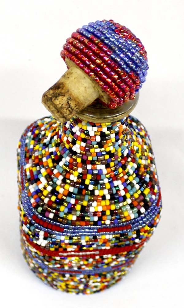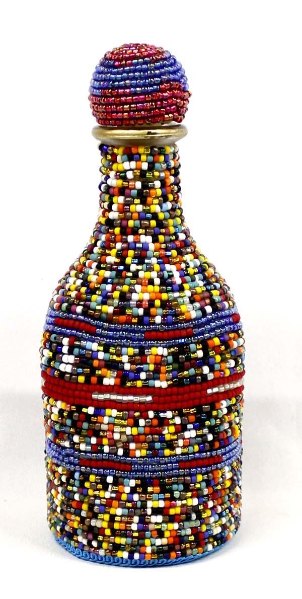 Beaded Glass Decanter by Kathy Kills Thunder, measures 10''H x 4'', nice vibrant colors, Artist Bio: Kathleen Kills Thunder (her legal name) was born in 1947 in Seattle, WA. Her father, Ben Kills Thunder, was a Sioux Indian from the Fort Peck Indian Reservation in NE Montana. Her mother was Spanish/Irish. Kathy grew up shuttling back and forth between Seattle and the Colville Indian Reservation in NE Washington. Kathy has been painting and beading since she was six. She uses a bright color palette and prodigious imagination in creating her painted and beaded work. Kathy currently lives in SE Arizona and raises buffalo when she is not pursuing her artistic endeavors.