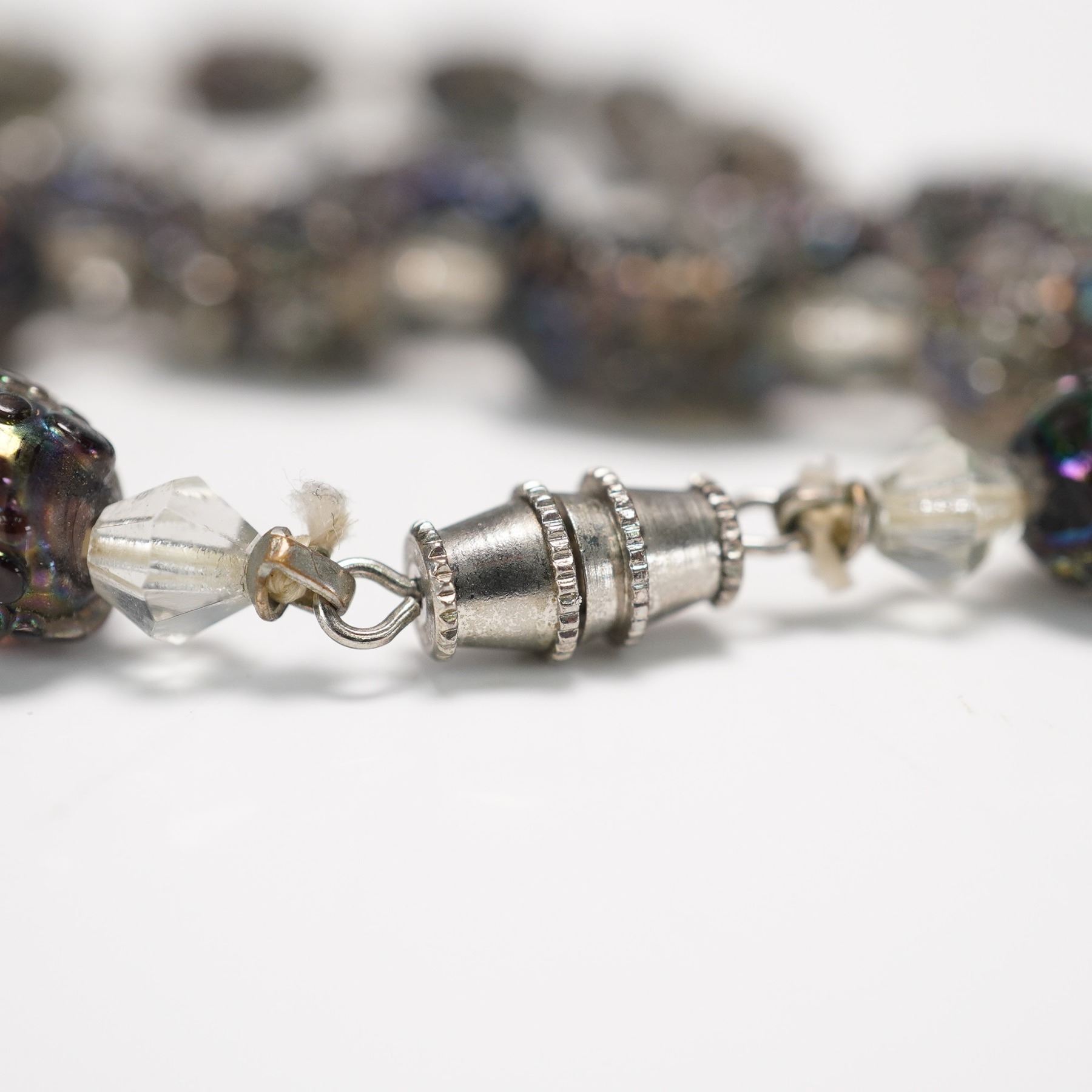 Necklace featuring glass beads with a textured surface, exhibiting a dark iridescent finish with multi-tonal hues. Each oval-shaped bead is interspaced with faceted clear glass spacer beads. The necklace is strung on thread and finished with a barrel screw clasp in a silver-tone metal. From clasp to clasp necklace is approximately: 41.25"L.