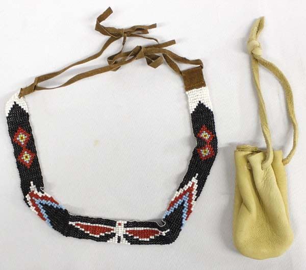 Beaded Hat Band and Doeskin Fetish Bag, hatband measures 17''L end to end, doeskin pouch is very soft and has drawstring closure, leather ties on the hatband