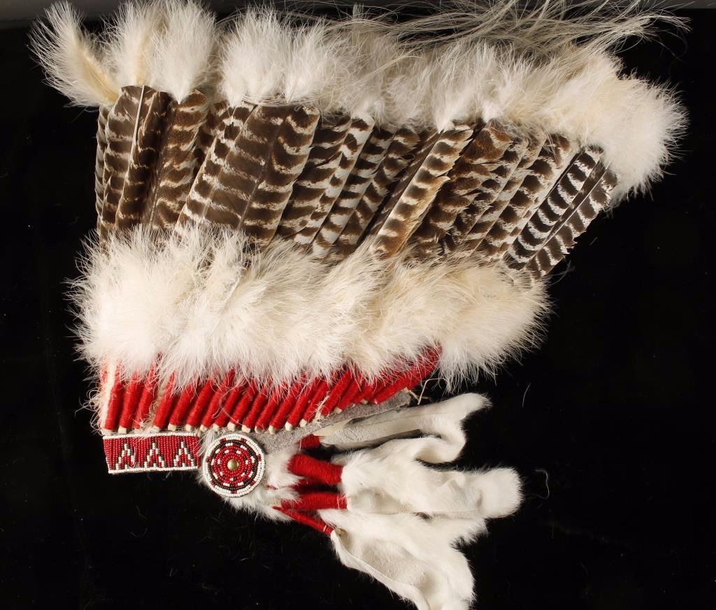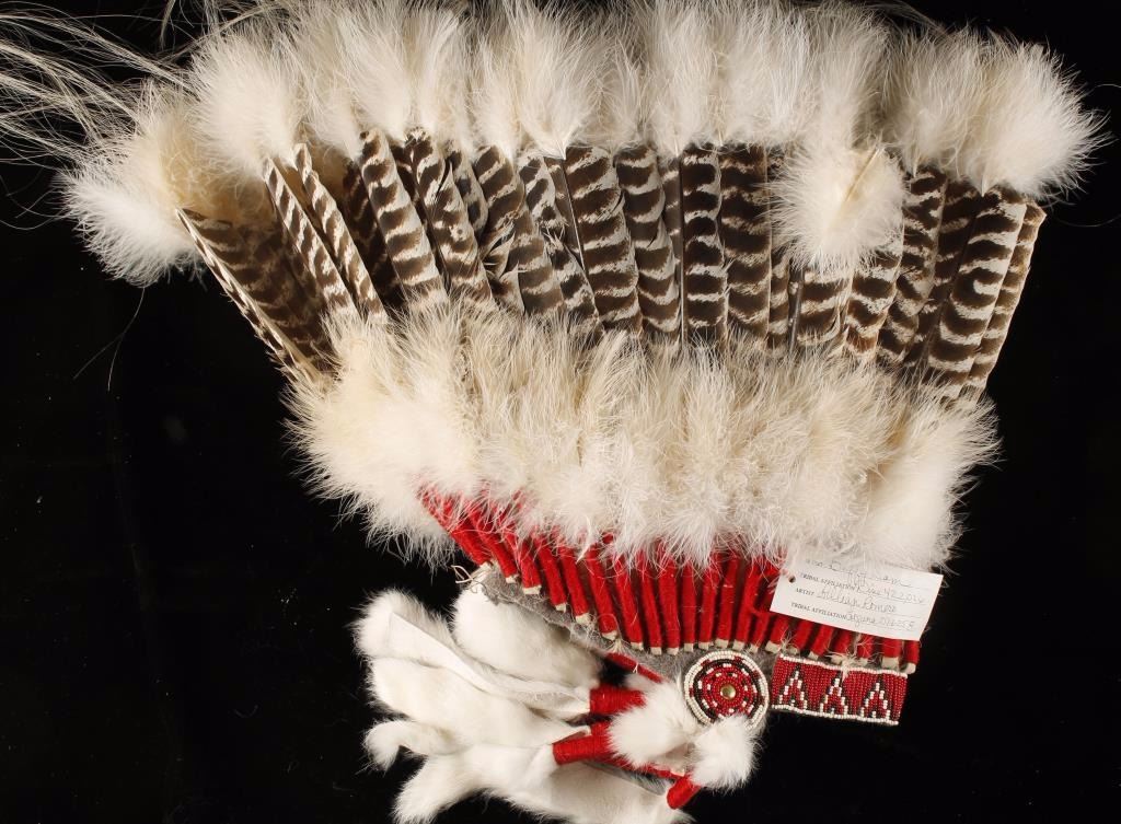 Buffalo Hogan Barred Turkey War Bonnet. Artists Buffy Sam and Lillian Romero. Red, black and white beaded headband and medallions with red wrapped feathers. Fur accents. Nice display piece.
