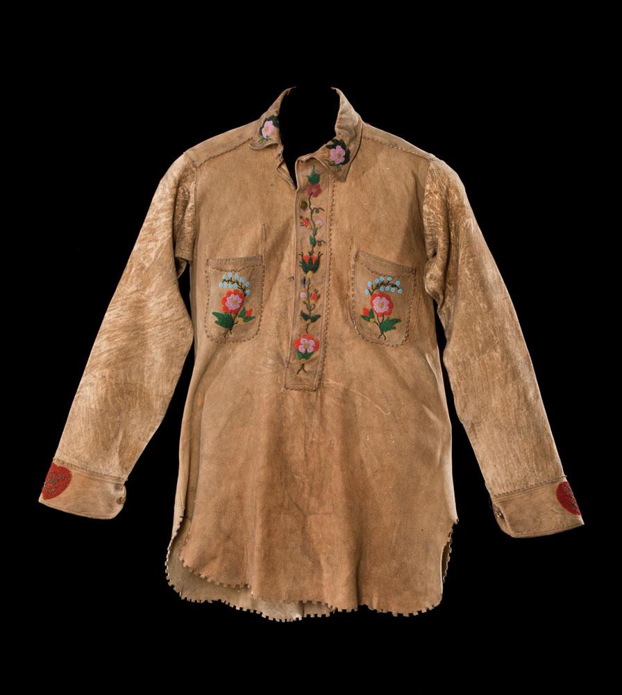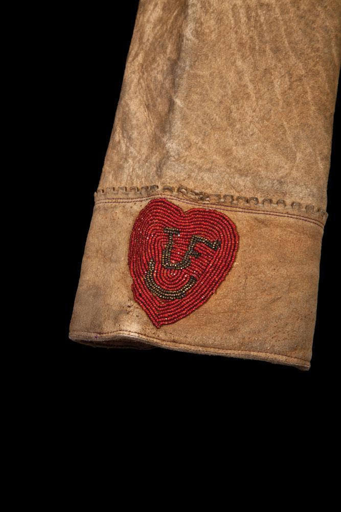 Used by Cottle in Buffalo Bill’s Wild West with the UF brand beaded onto the sleeves. Pinked edges, beads on collar, pockets, and front. Pullover style with two brass buttons (one missing).