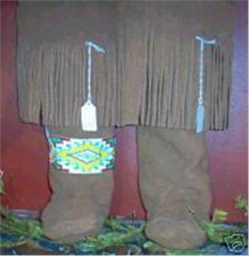 These high boots were made by myself a Mohawk aboriginal. These boots are beaded on the front with real seed beads done on an old authentic loom. The material is genuine dark brown cow hide. Please specify size when ordering. Please allow 2 week delivery