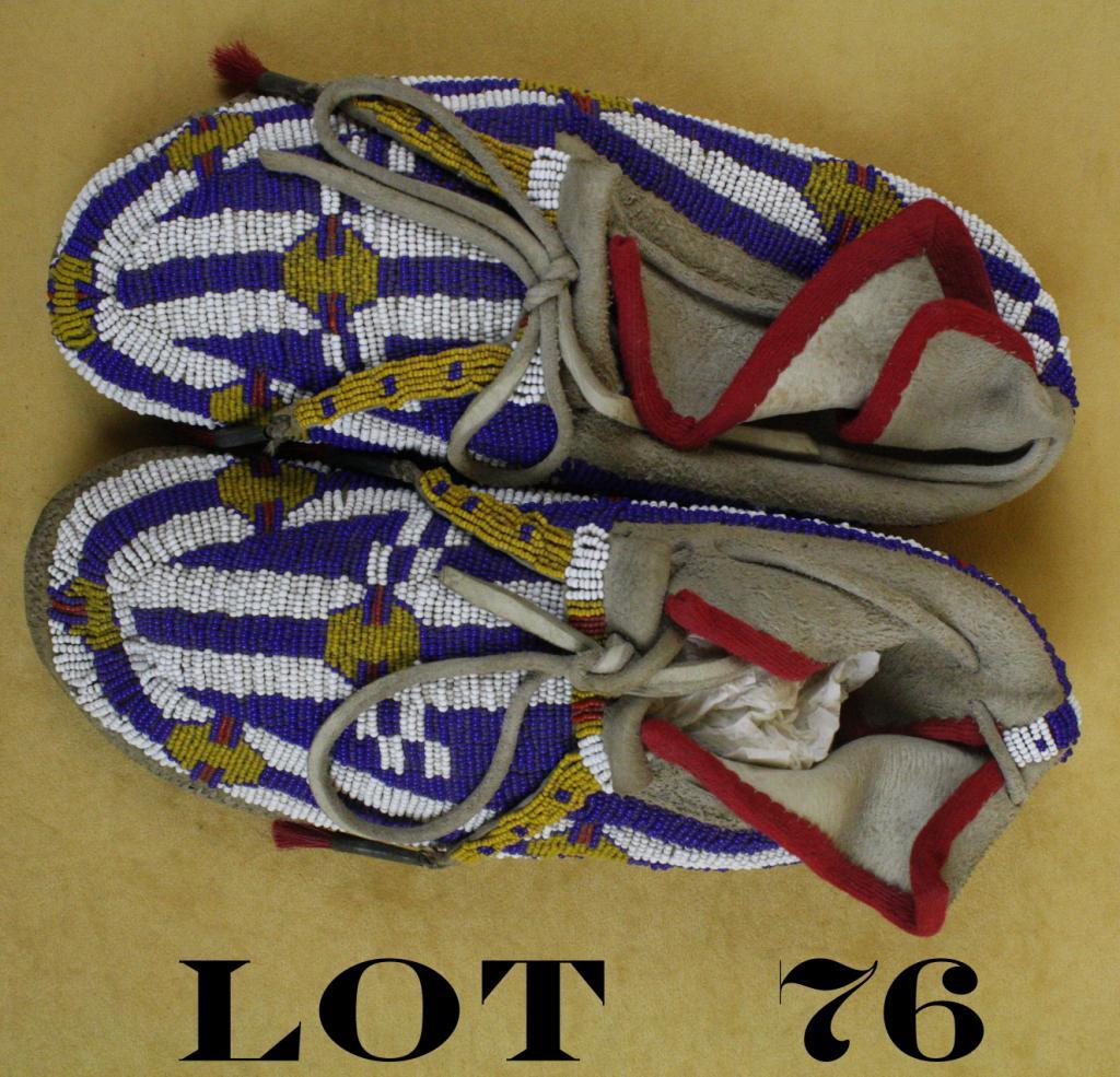 Beaded Indian moccasins in overall good to very good condition with extensive coverage of red, white, blue and greasy yellow beads with tin cones and beaded tassels and thick matching rawhide ties. This pair is verynicely accomplished with red cloth piping around the tops of the ankle areas; soles are very good showing minimal wear. Est.: $500-$900.