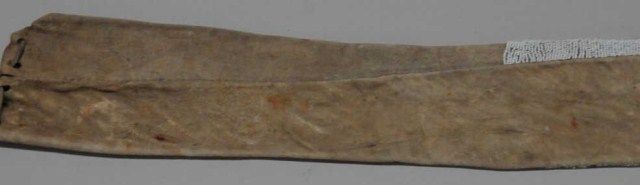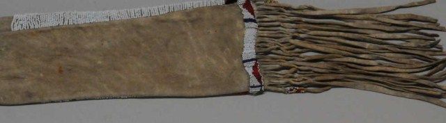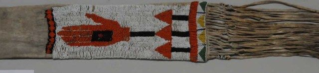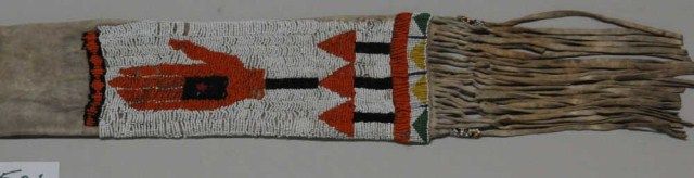 Beaded Indian pipe bag approx. 36” long and approx. 5” wide with beaded panel covering approx. 12” of the lower portion of the bag that also shows fringes at the bottom with beaded accents. This bag is in overall verygood condition with some scattered losses; the design is unique showing a large orange hand symbol with black square with red section in center of black, all in seed beads and other designs in orange, black, greenand greasy yellow seed beads with white seed beads as background; accompanied by a copy of pages from “Hau, Kola!” by Barbara Hall, showing selections from the Plains Indian Collection of the Haffenreffer Museum ofAnthropology where it is indicated that the hand symbol is one of the oldest in North America and seems basically to symbolize power and denotes bravery among the Hidatsa and Arikara Indians. Est.: $1,000-$1,800.