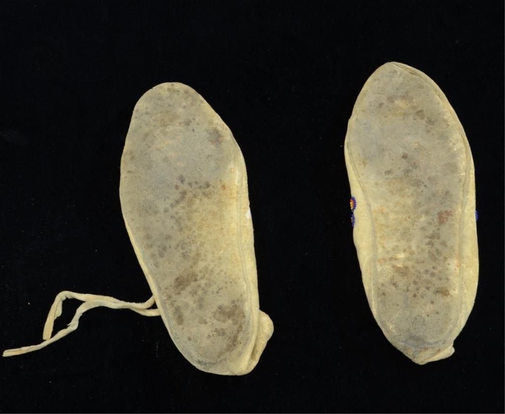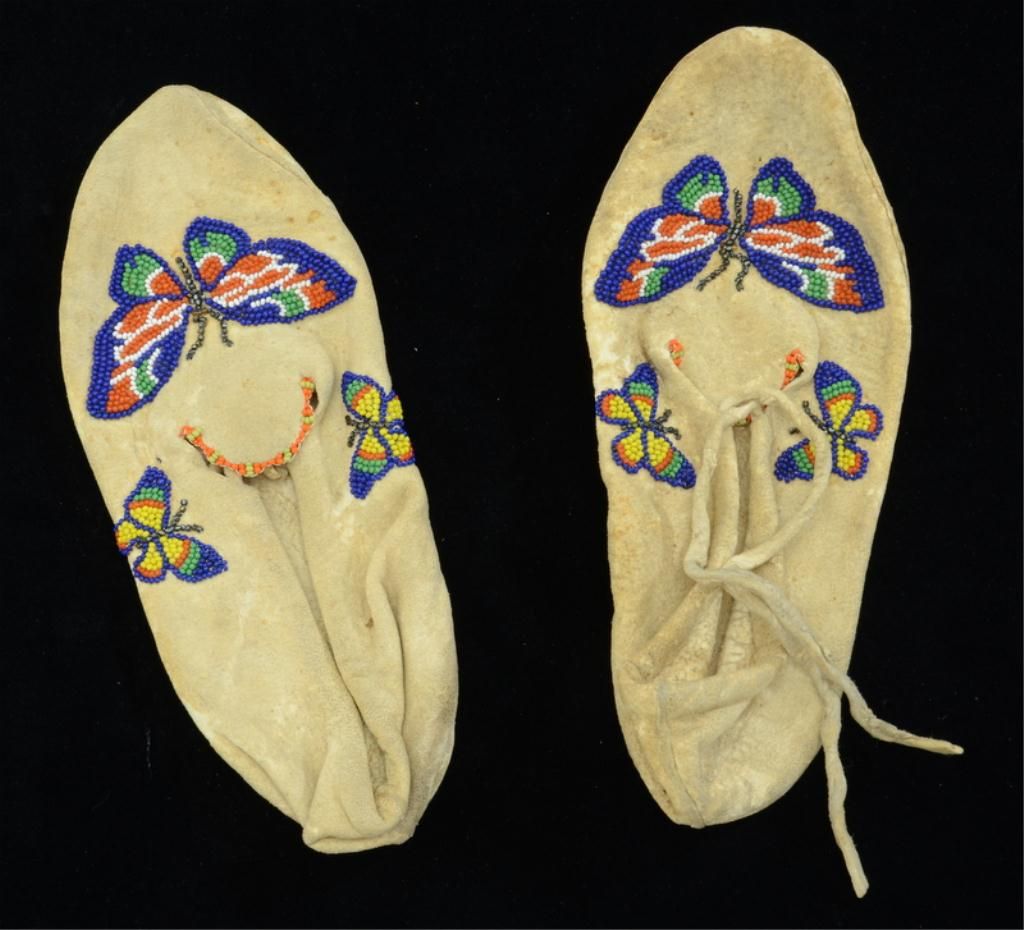 Beaded Indian woman’s moccasins in butterfly pattern; overall good condition and nicely accomplished; multi-colored beads including orange, white, purple, yellow and green. Est.: $125-$250.