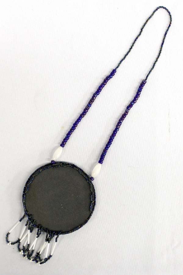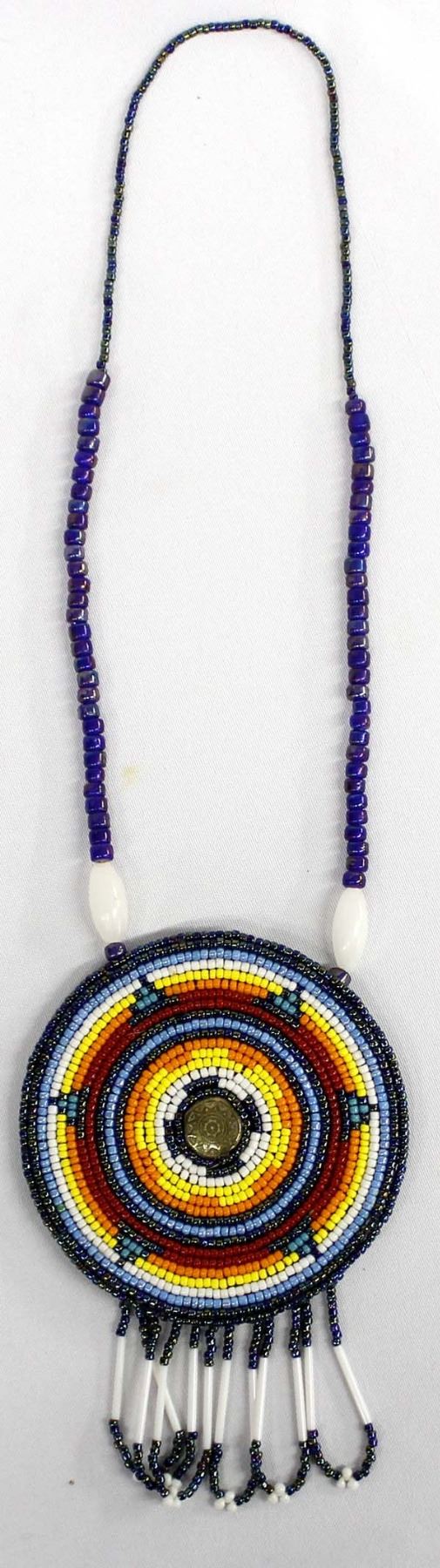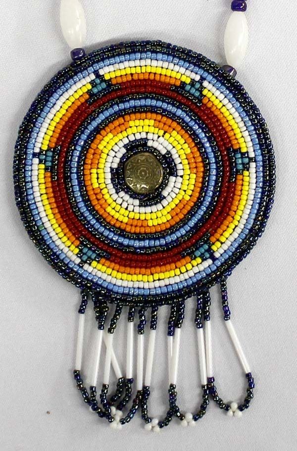 Beaded Medallion Necklace by Kathy Kills Thunder, medallion measures 4.5''D x 6.75''L, necklace measures 24''L end to end, brass button embellishment, beautiful warm colors