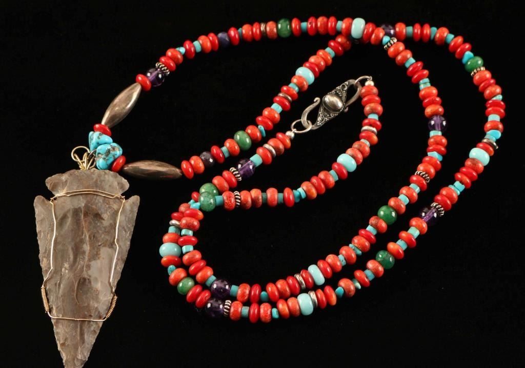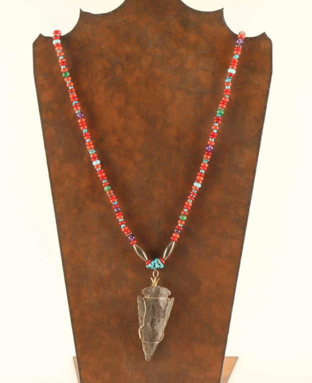 Coral, turquoise, sterling and amethyst beads suspend a 2 1/2" wire wrapped arrowhead. Measures 27" long.