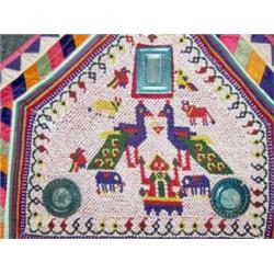 Beaded "Home Plate" shaped banner with peacocks, 25 1/2" long x 22" wide