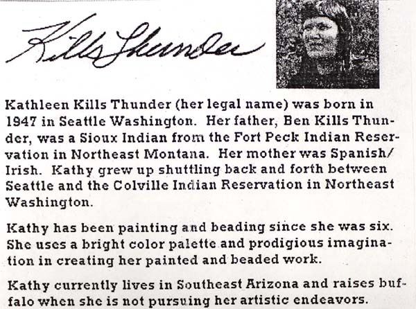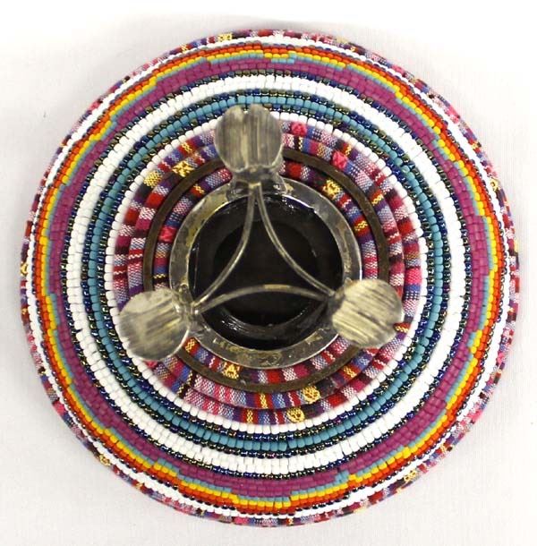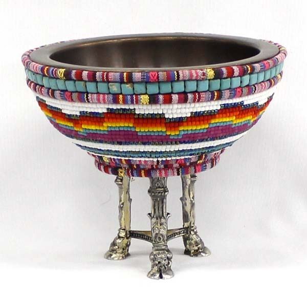Beaded Pedestal Bowl by Kathy Kills Thunder, base is marked Pairpoint 4990 and has elephant feet, measures 6.25'' x 7.5'', beautiful colors, she incorporated beadwork and colorful cloth rope, Artist Bio: Kathleen Kills Thunder (her legal name) was born in 1947 in Seattle, WA. Her father, Ben Kills Thunder, was a Sioux Indian from the Fort Peck Indian Reservation in NE Montana and her mother was Spanish/Irish. Kathy has been painting and beading since she was six.