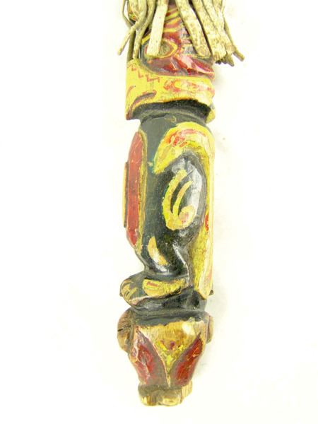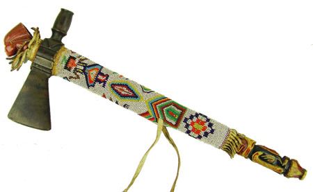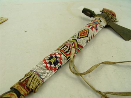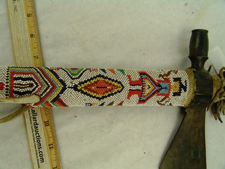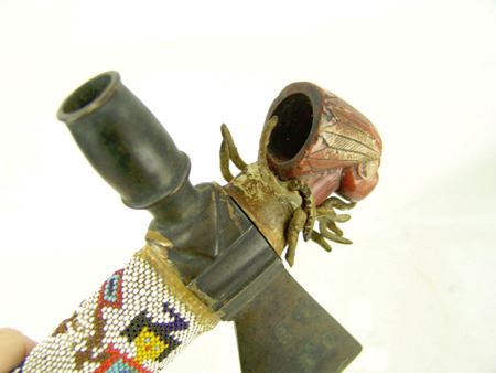 Early 1900s, Very interesting solid brass head with carved catlinite Indian head on the end and with a fully beaded stem with human figures and symbols and carved eagle near the tip. Very good condition. 20"