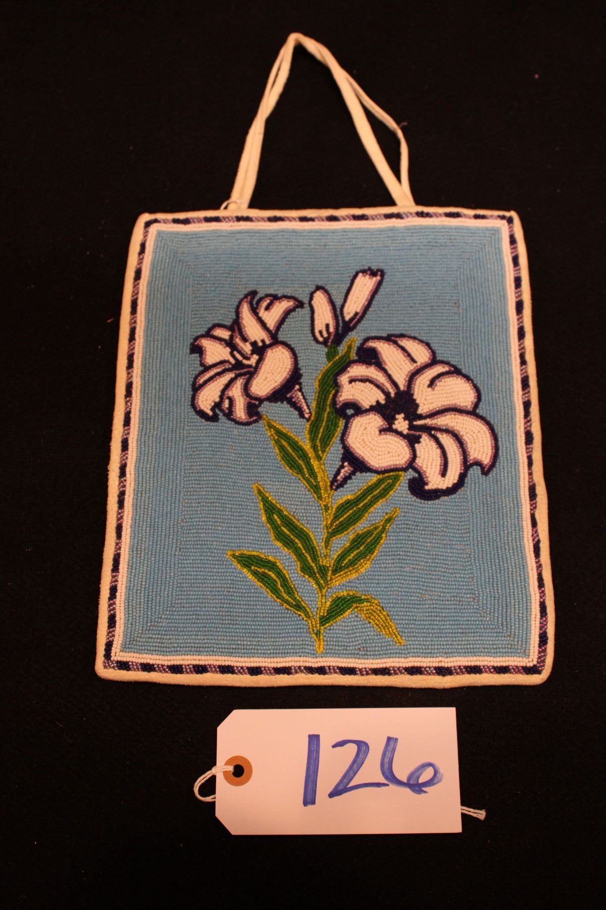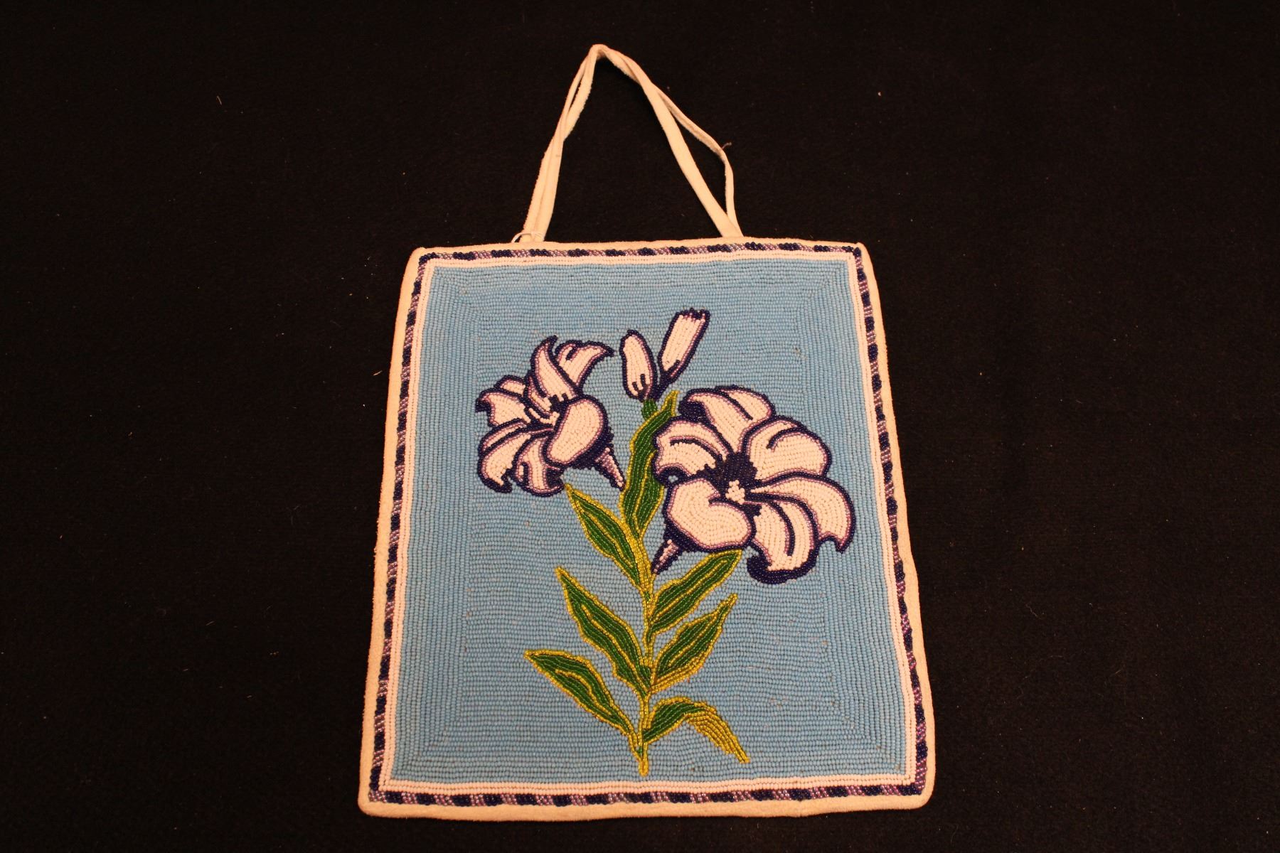 Lilies on blue backgroun. Hide binding on back. Vintage cotton lining. 9" w x 11" h