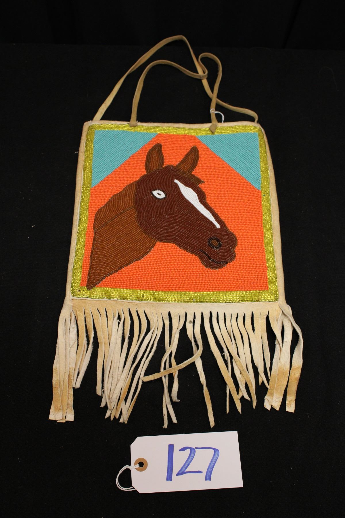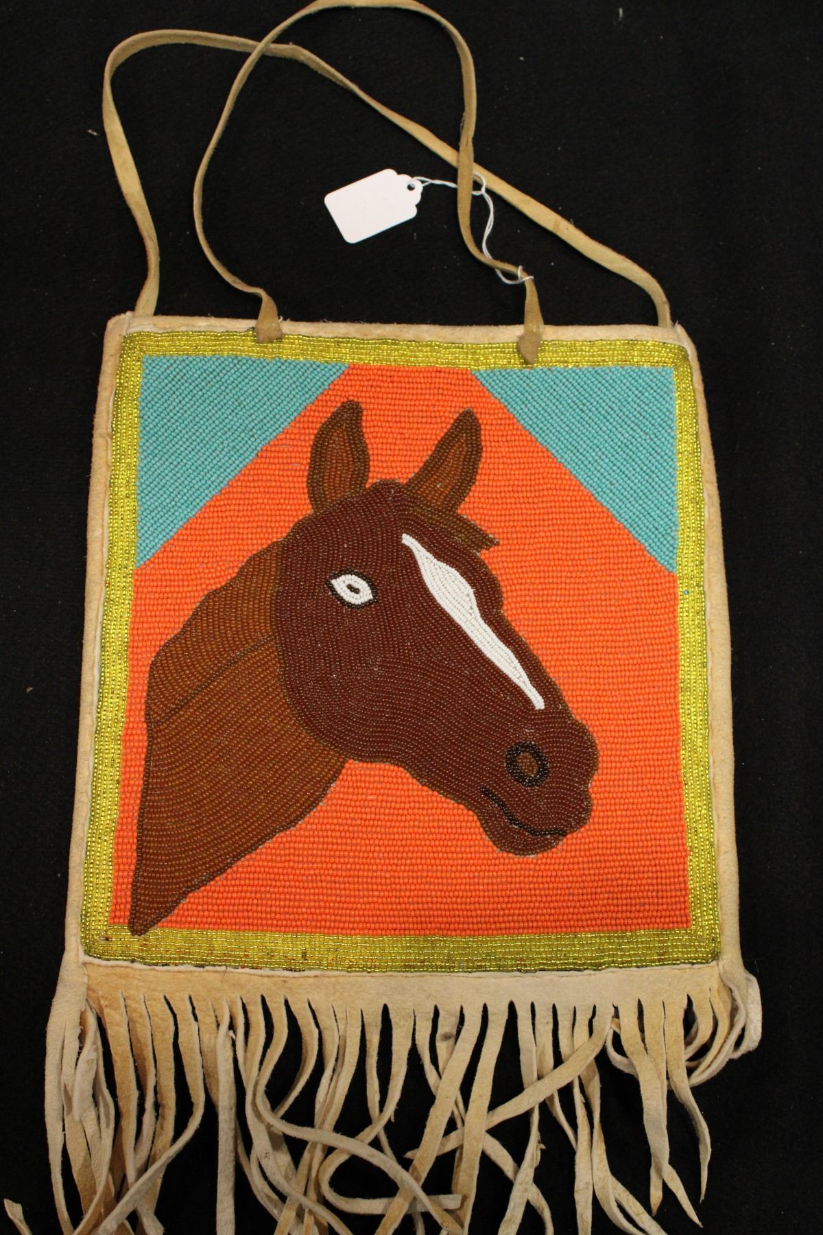 Horse head w/ orange background and blue upper corners. Blue wool backing. Canvas lining. Fringe. 10.5" w x 12" h