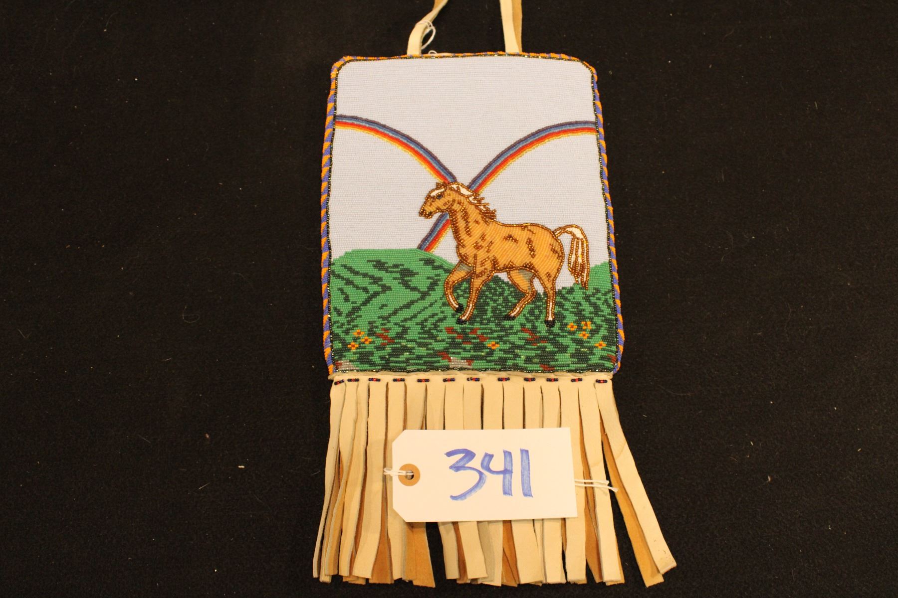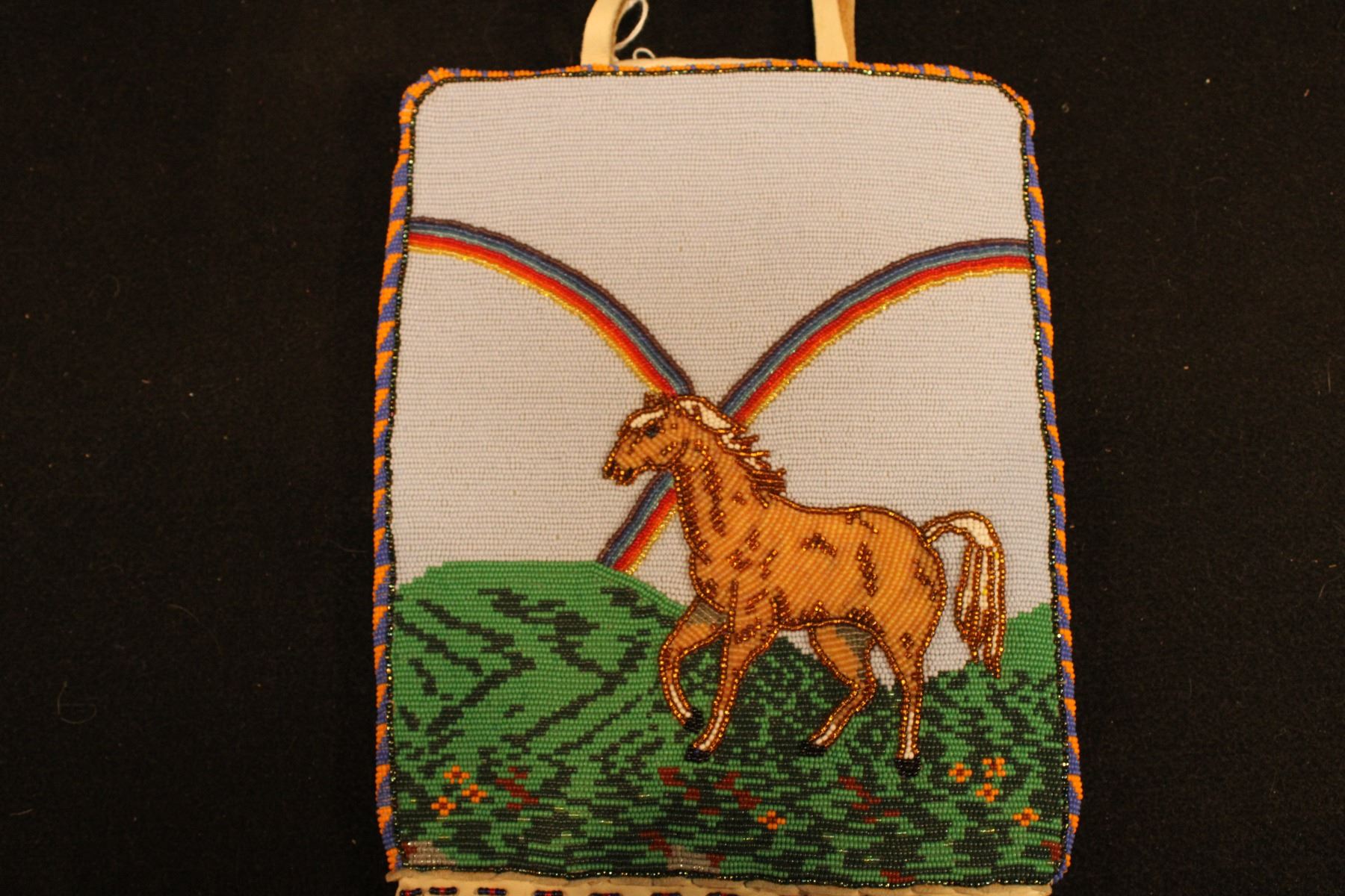 Horse in field w/ rainbow sky. Beaded binding. Fringe. 8.25" w x 10.5" h