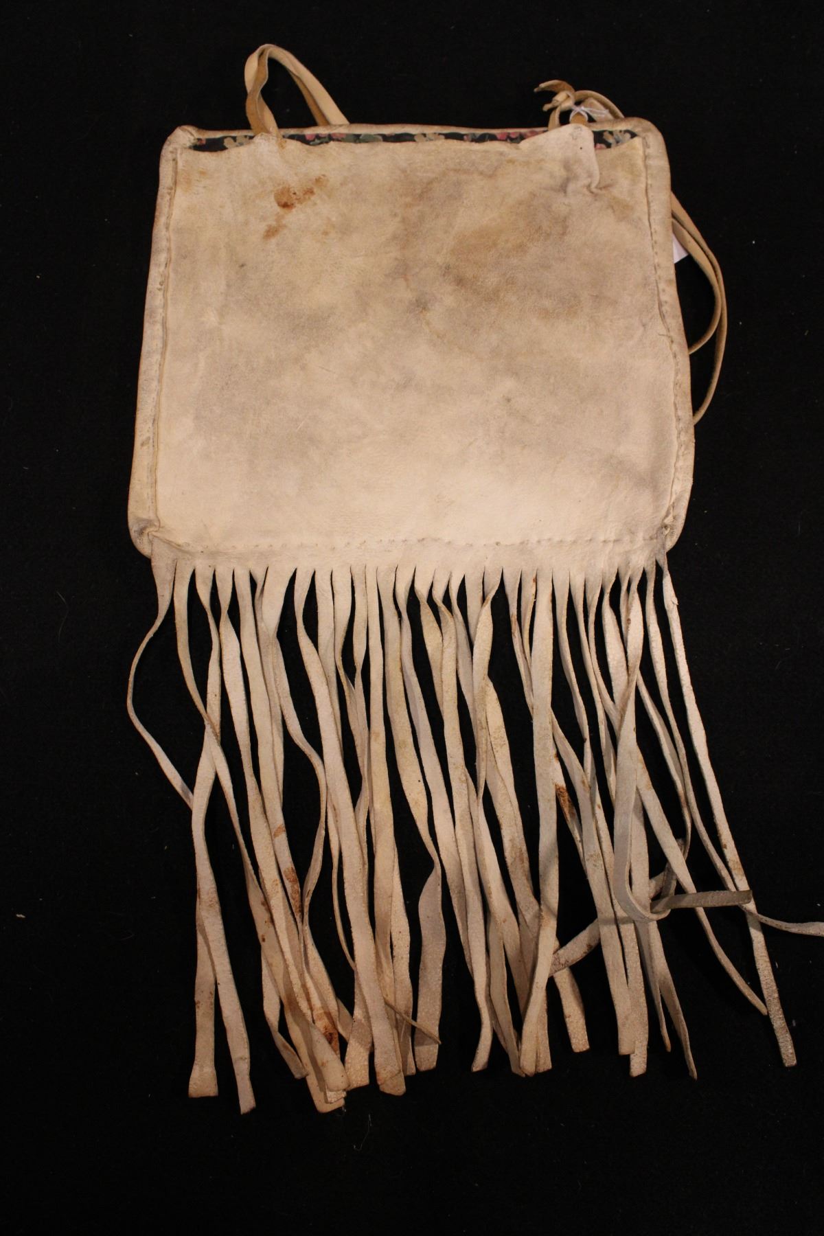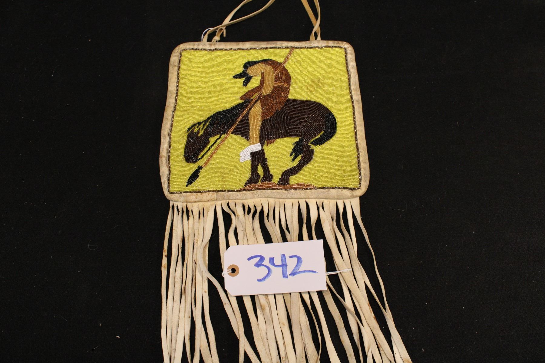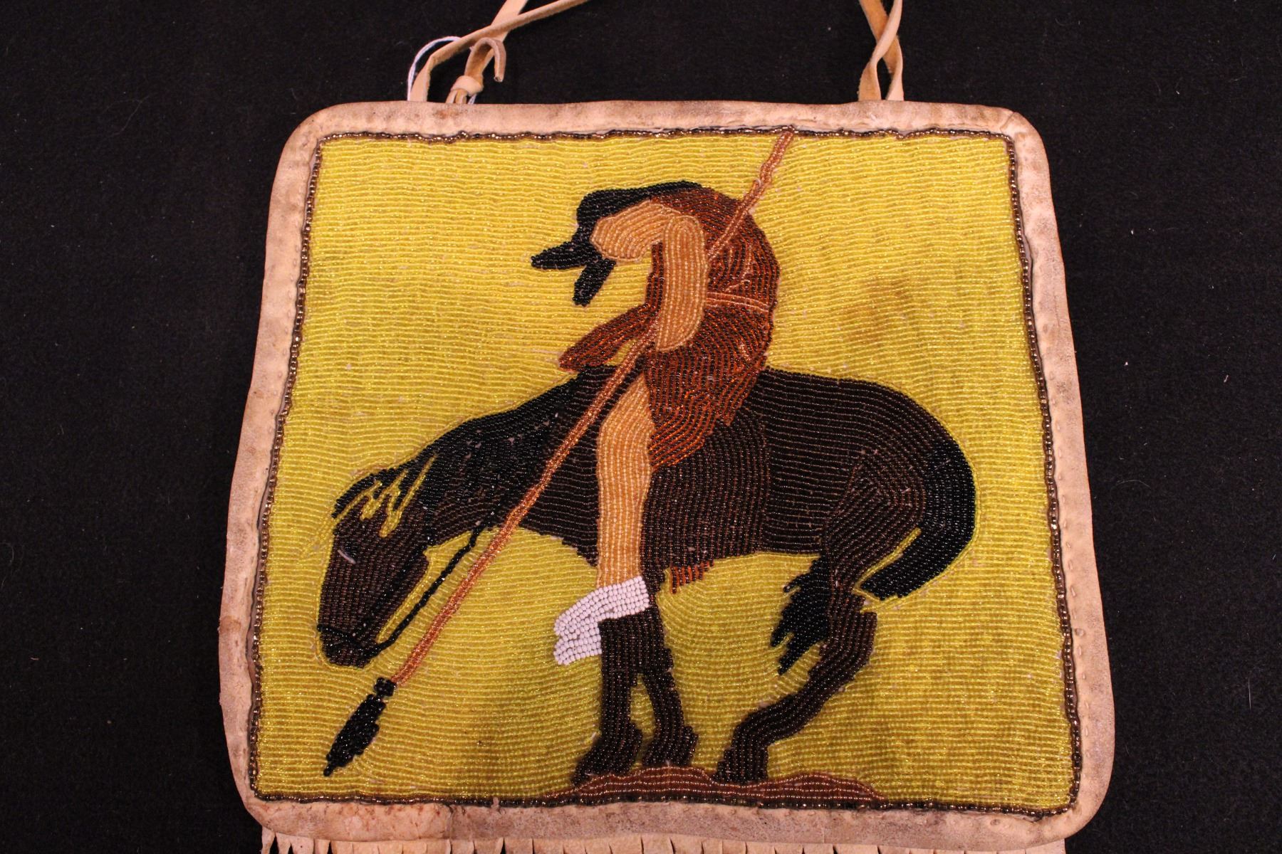Pictorial "End of the Trail" on a yellow lazy stitch background. Cotton lining w/ pocket. Fringe. Glass beads. Vintage. 11" w x 9.75" h