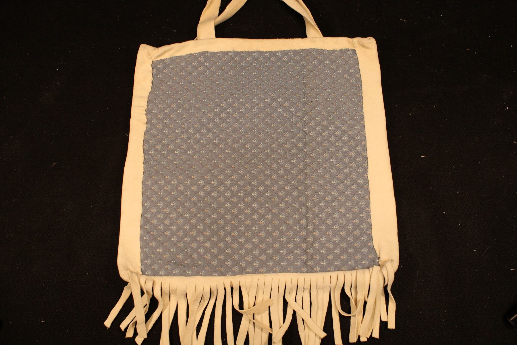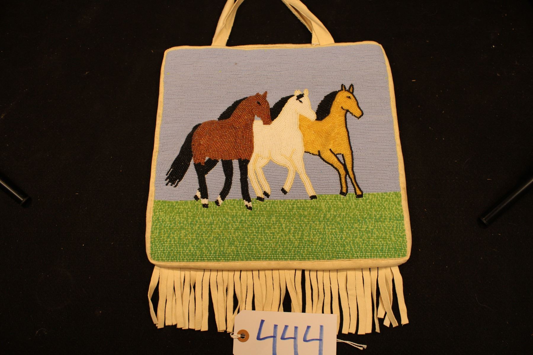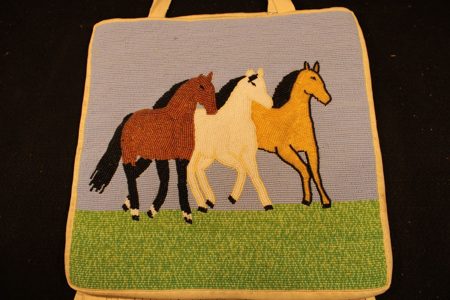 3 horses in pasture w/ sky. Hide binding. Fabric backing. Fringe. 13 x 12.5