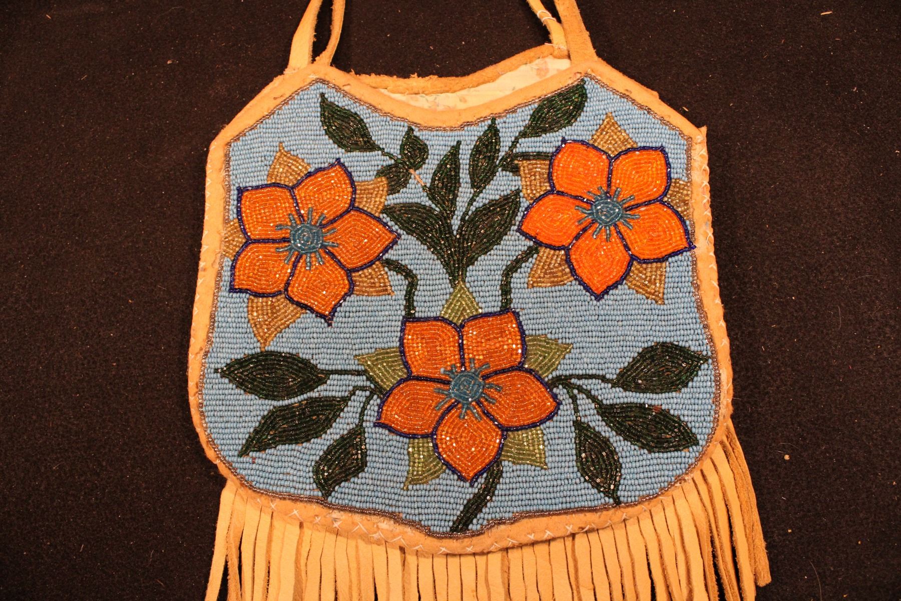 Shield shaped. Orange flowers on blue background. Vintage cotton linings. 8.5 x 7.5