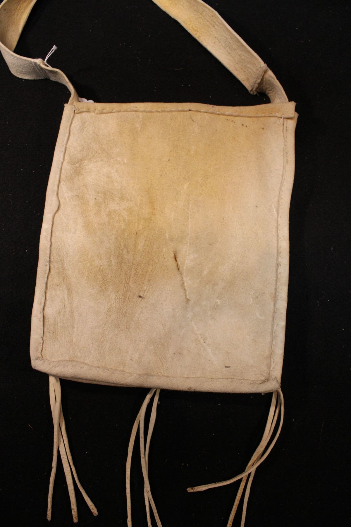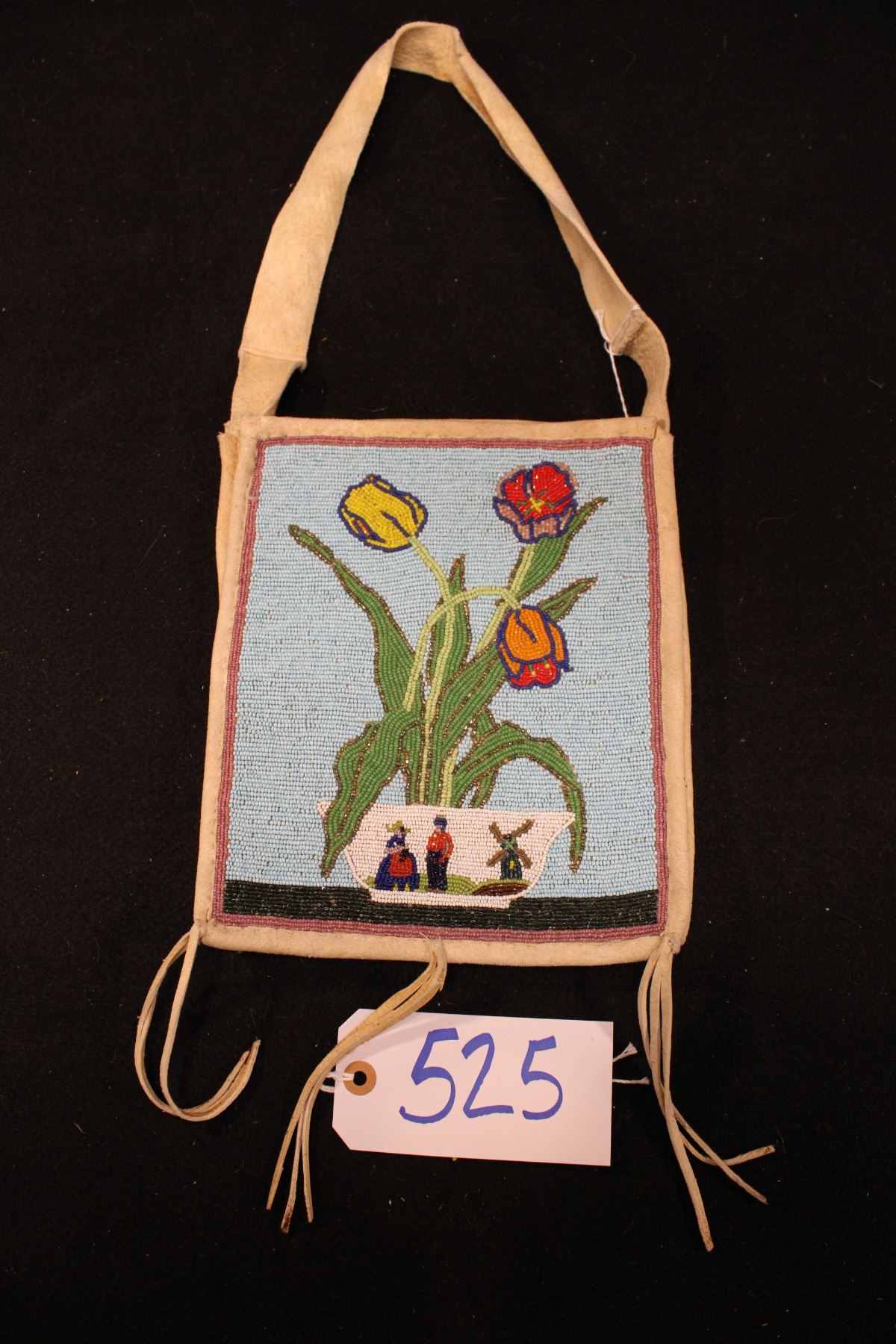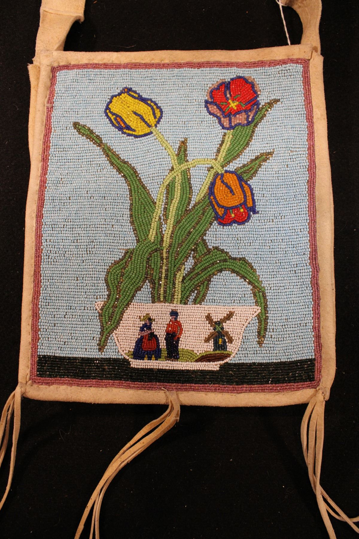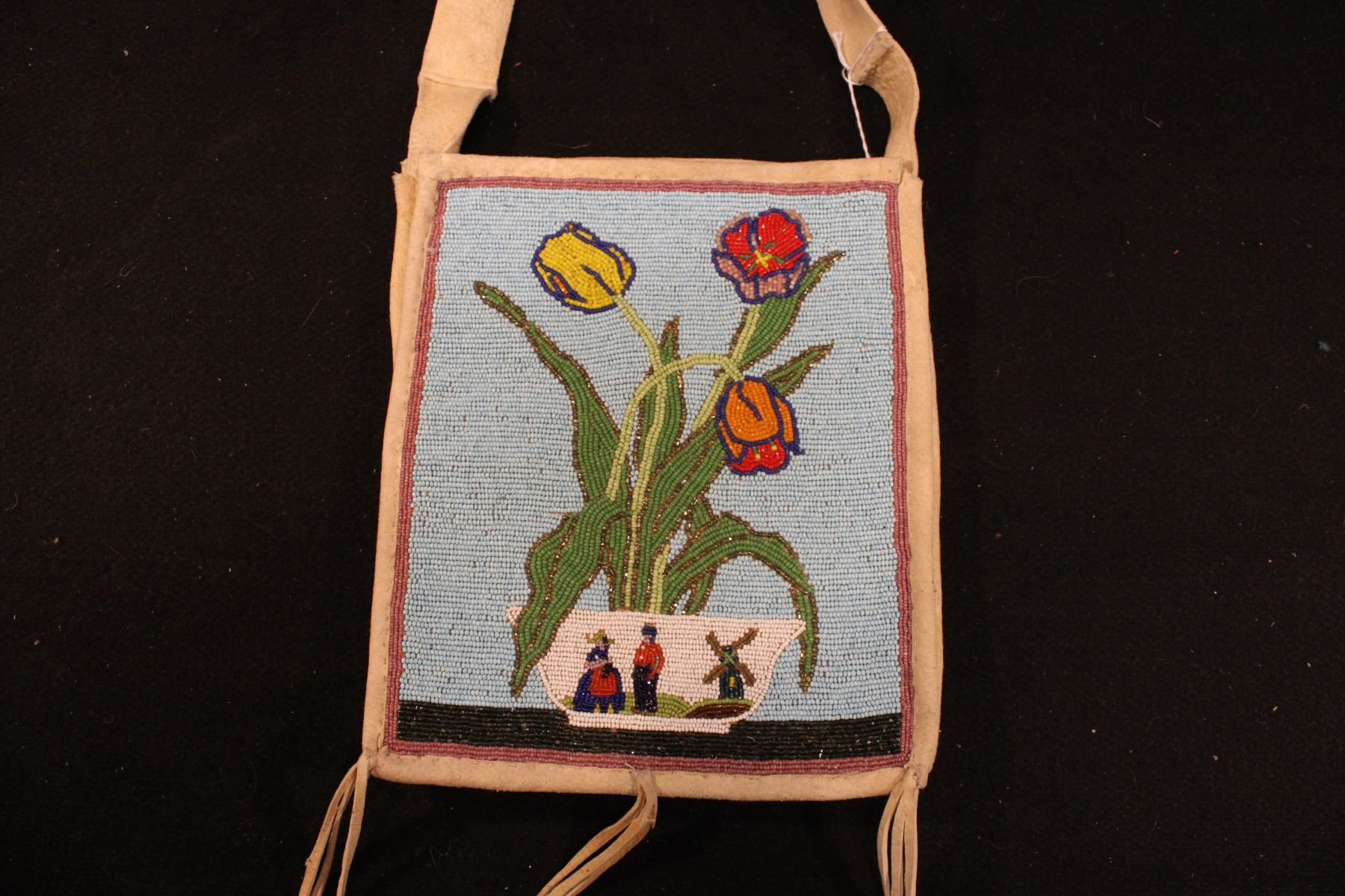 Tulips and Dutch bowl. Blue background. Buckskin tassles. Deerhide back w/ cotton lining. 8.5 x 10