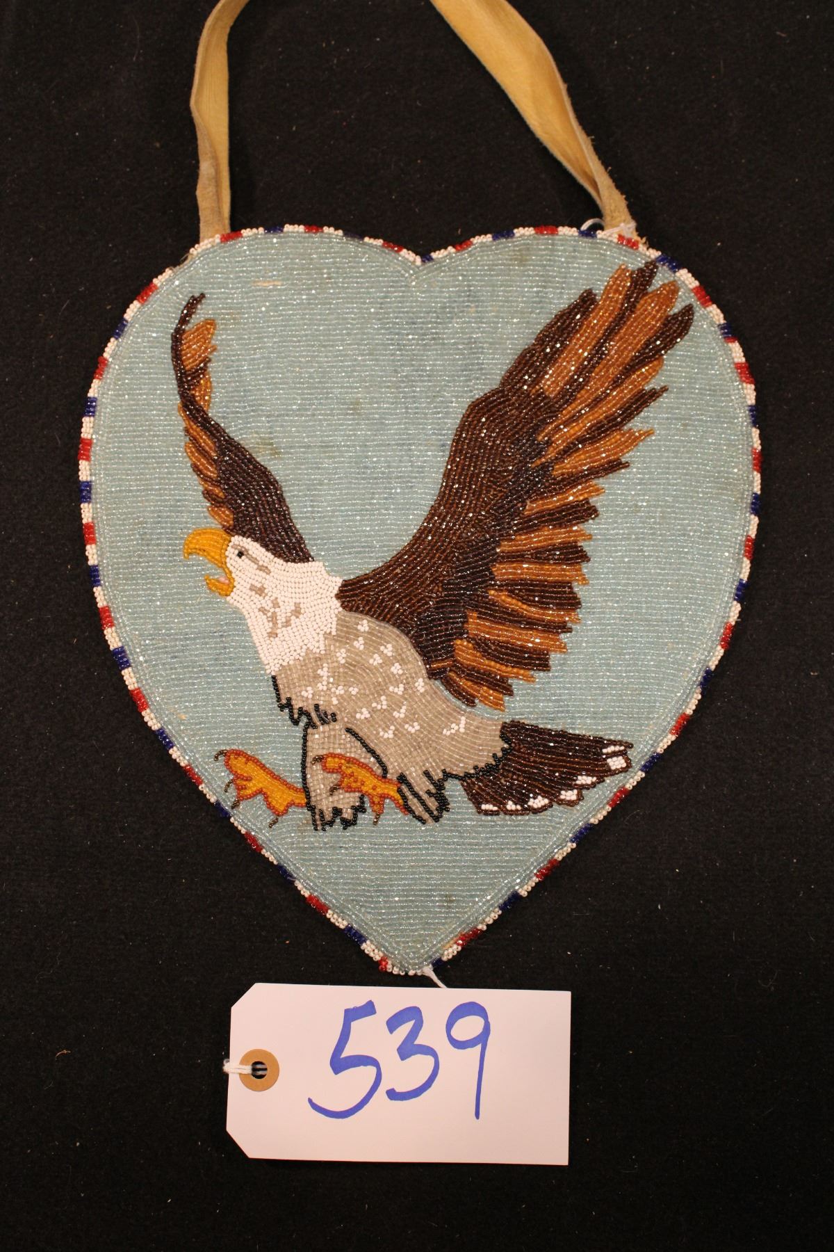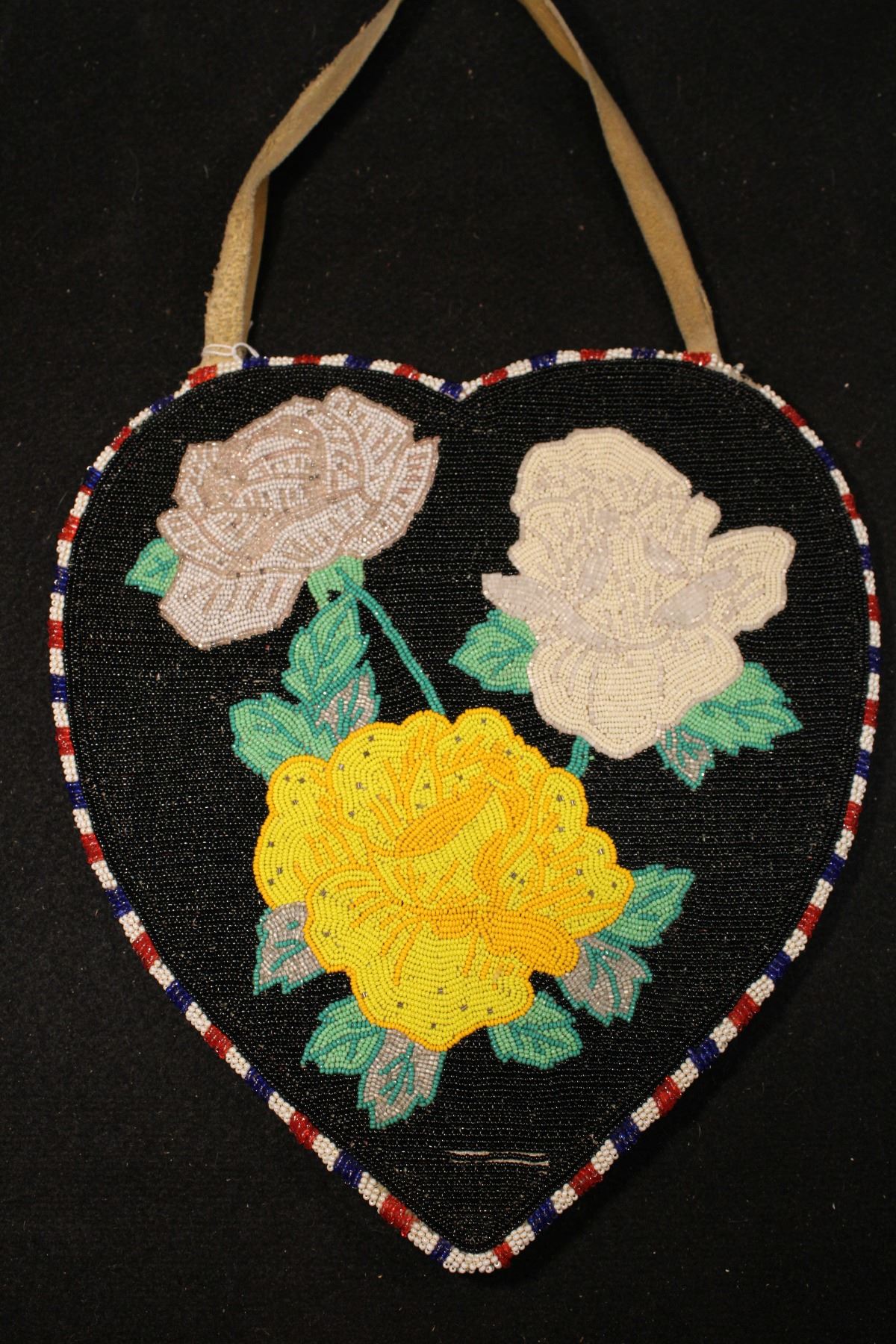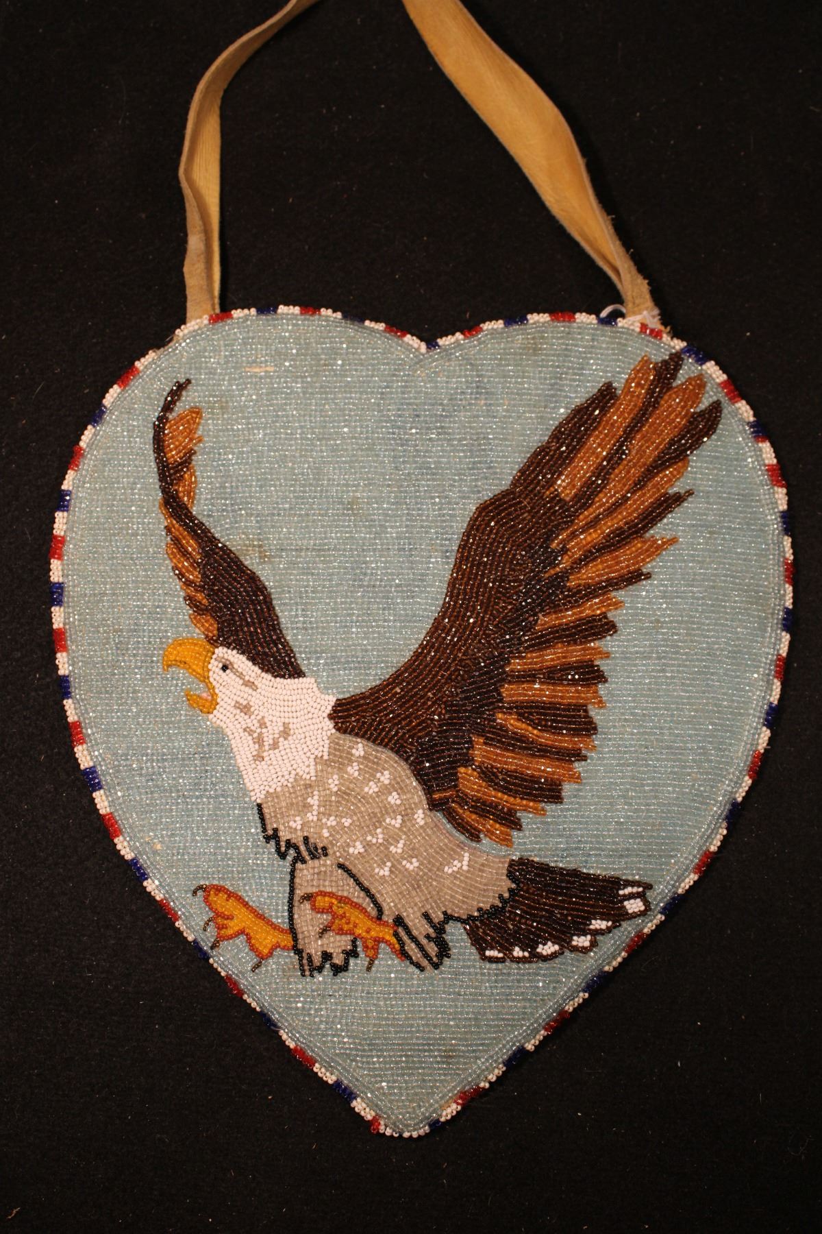 Heart shaped. Two sided. Eagle on blue background. Flowers on black background. Beaded binding. 10" x 11.75"