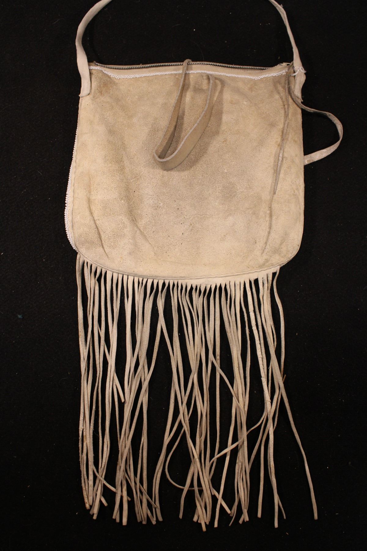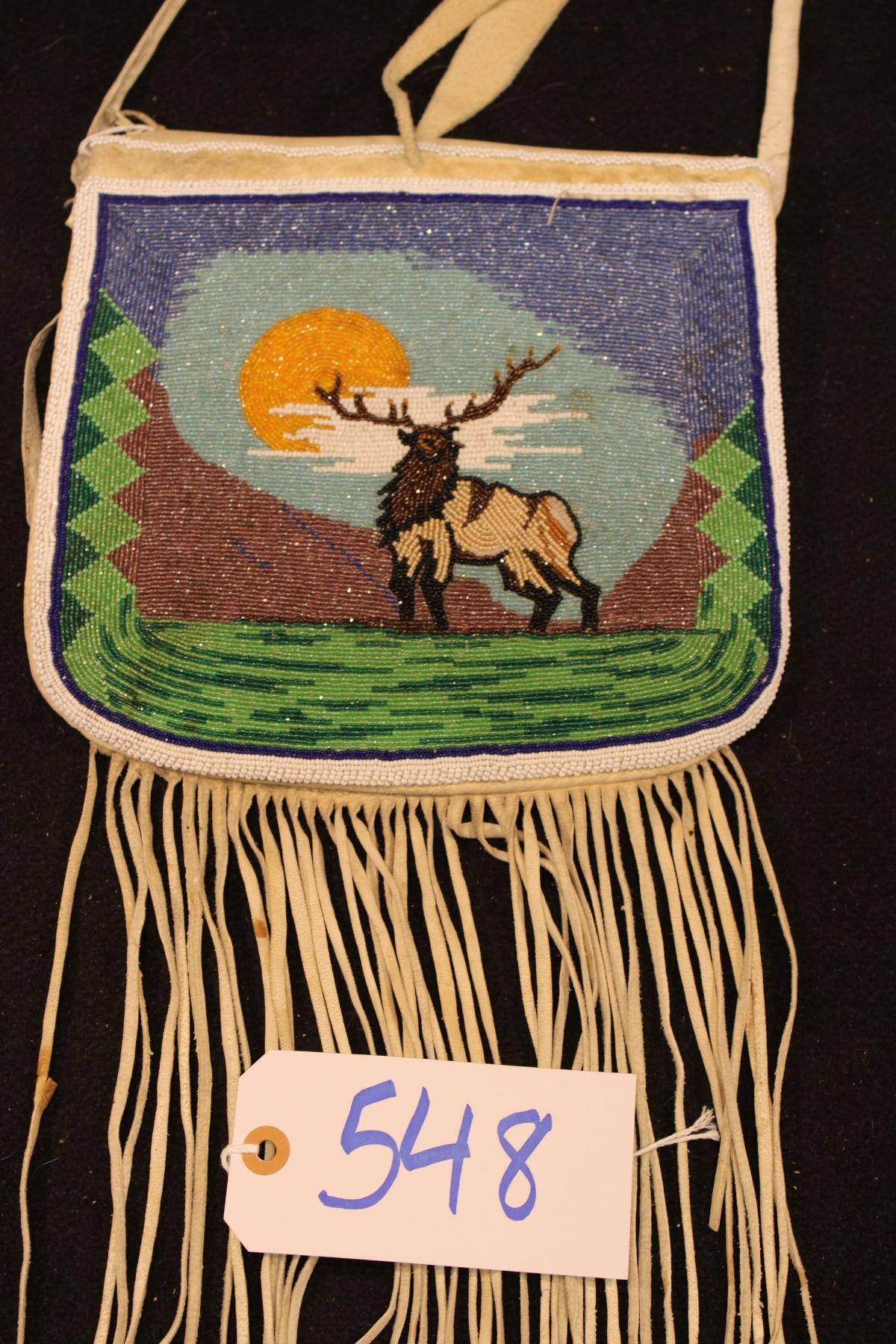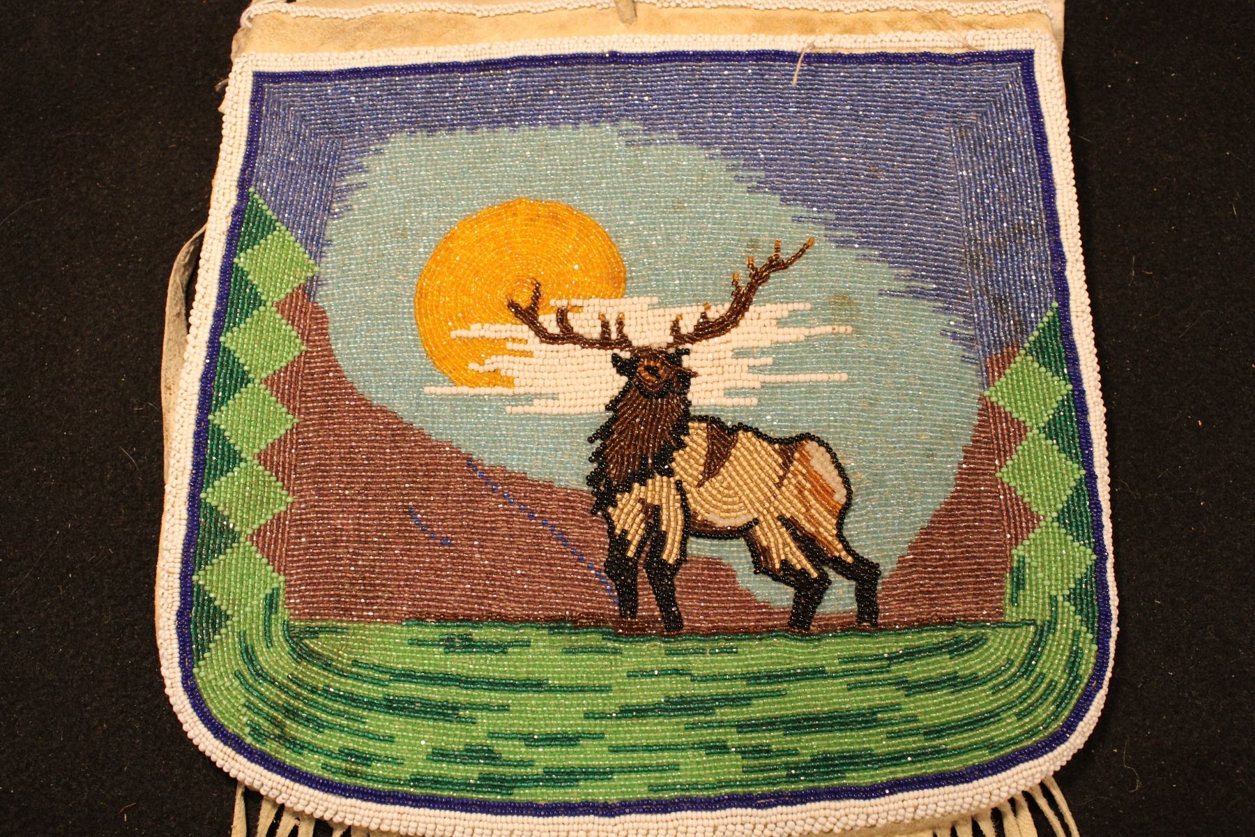 Elk in field w/ mountains, sky, sun, and cloud backgrounds. Beaded Binding. Zipper. Interior pocket. Fringe. 9.75 x 9.5