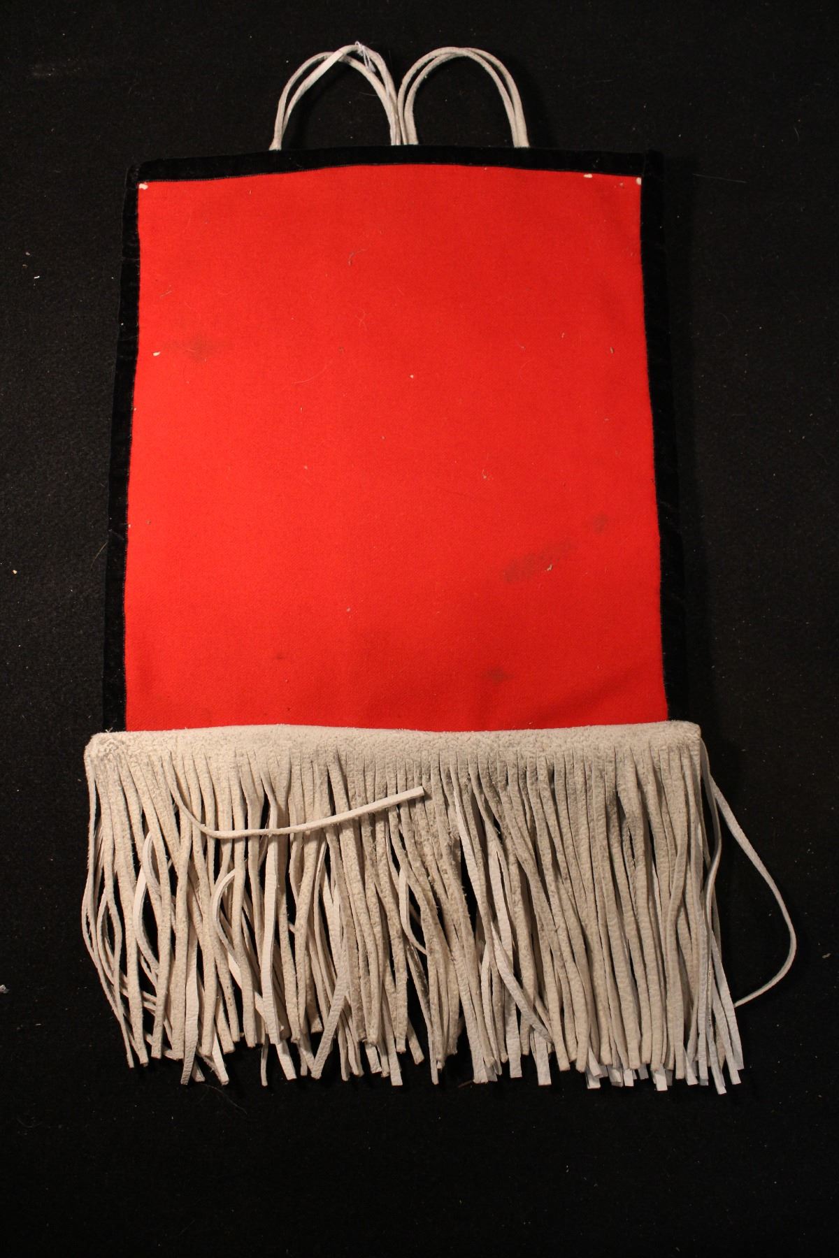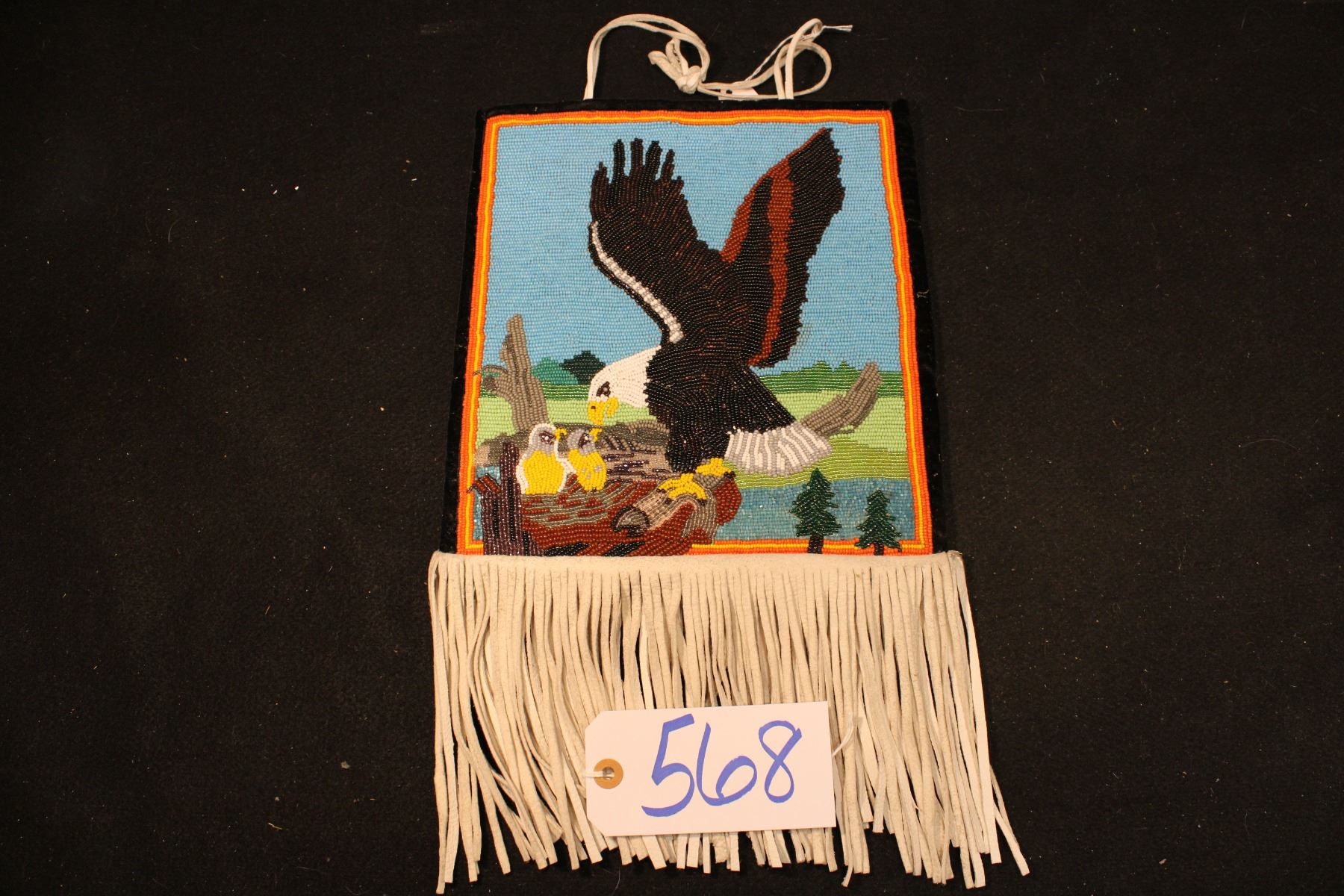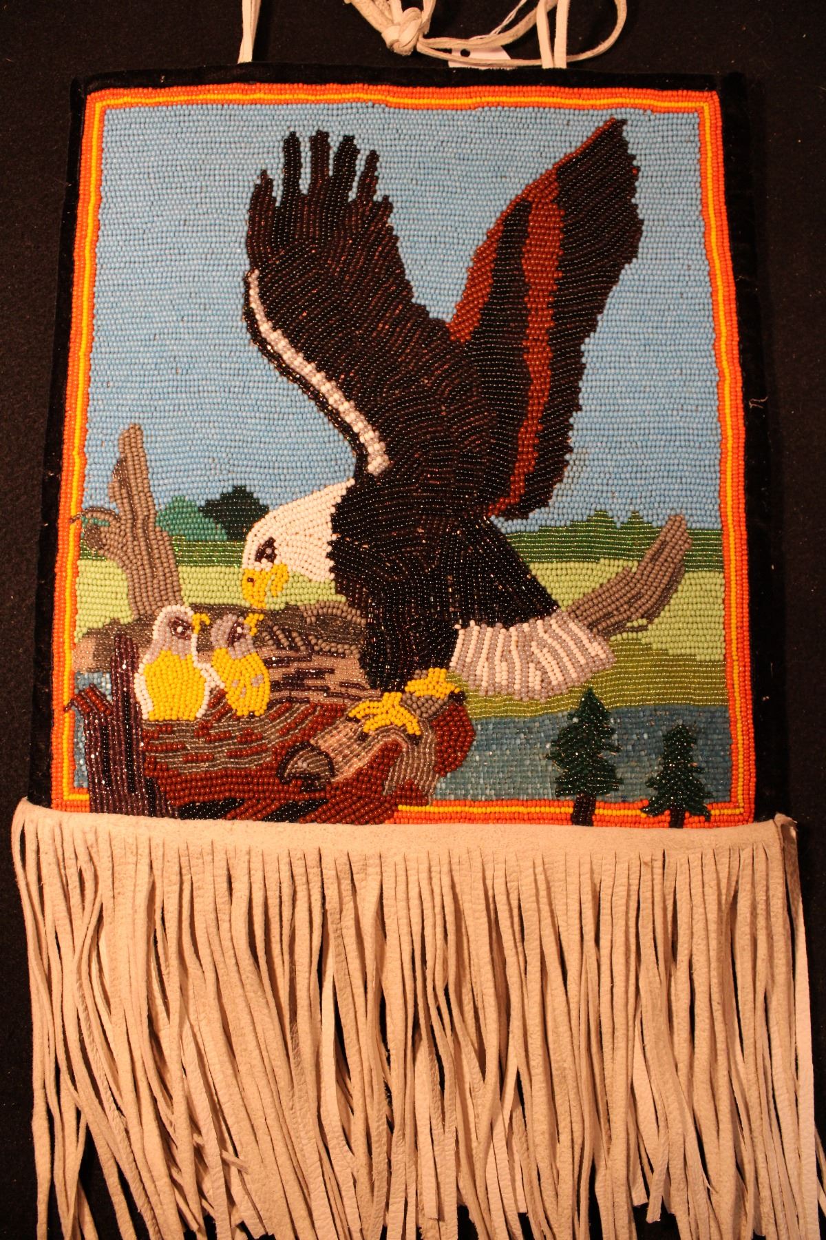 Pictorial eagle feeding chicks. Fringe. Velvet binding. Red wool back w/ moth holes. Sinthetic lining. 15. 11.5