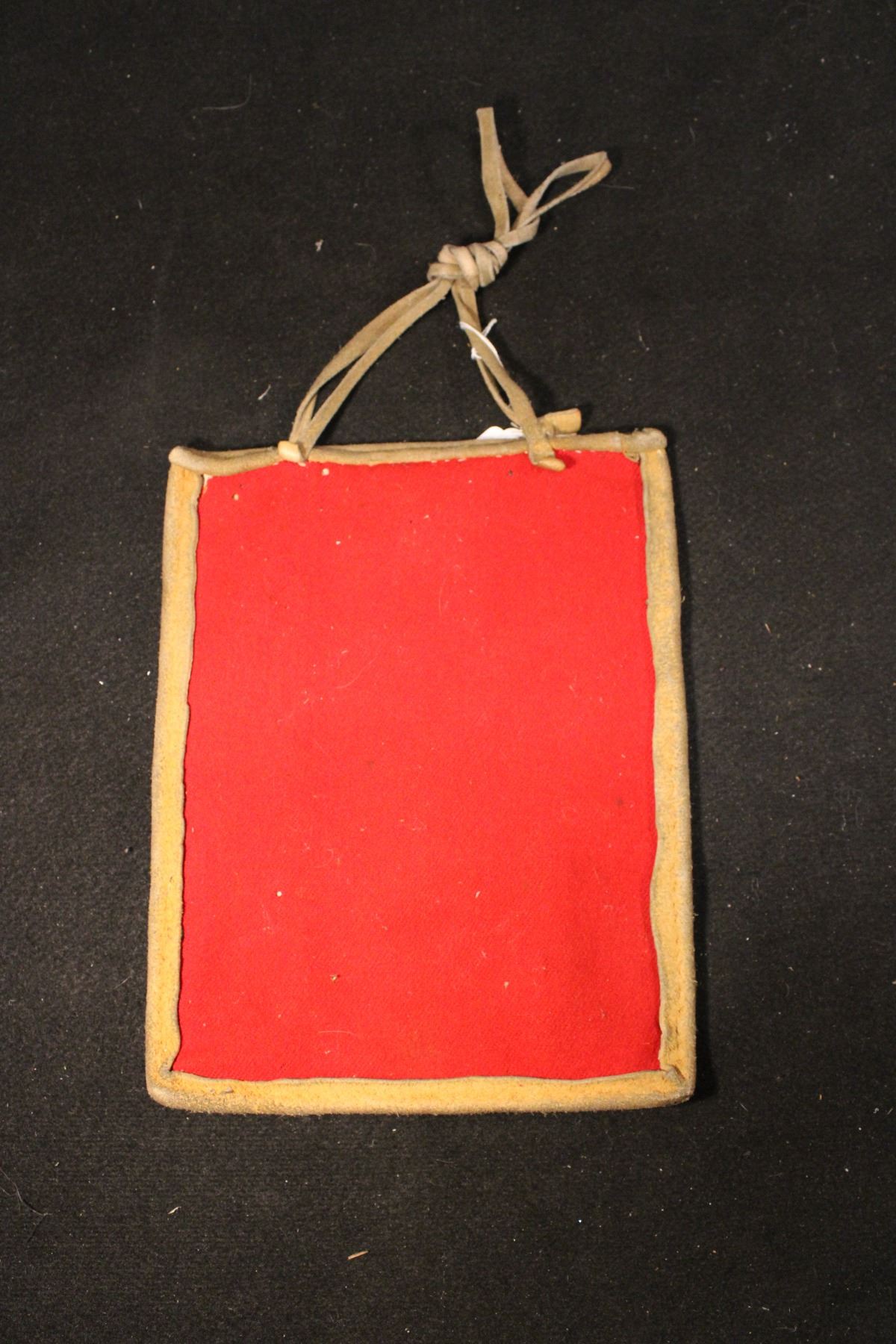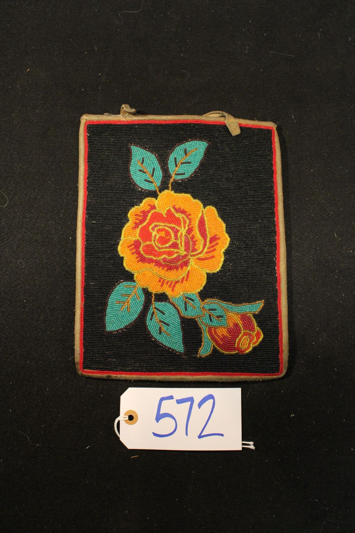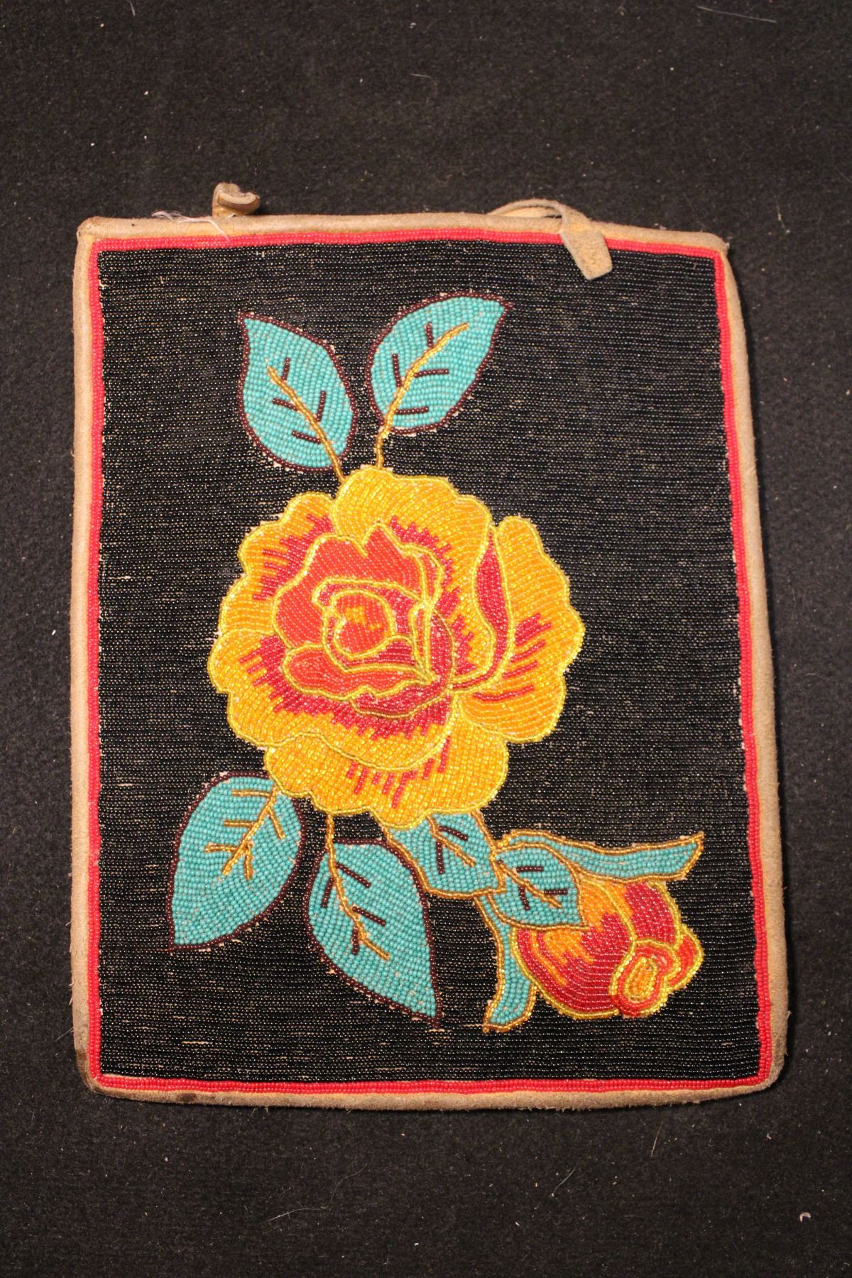 Orange red roses on black backgrournd. Hide binding. Red wool backing. Vintage cotton lining. 8.5 x 10.75